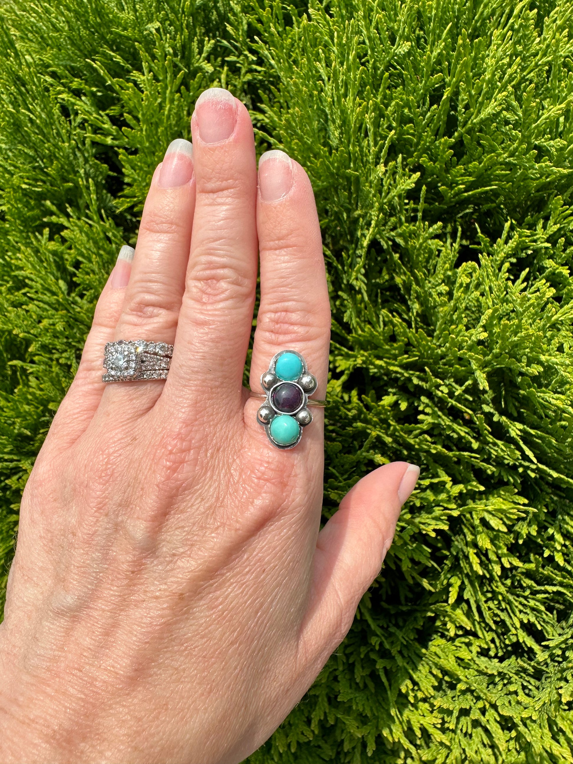 This 3 Stone Stacked ring will be made into the buyers size. Made from .925 Sterling Silver and .999 Fine silver and adorned with two turquoise rounds and one heated welo opal. The opal in this ring really sparkles in the sun and pictures just don’t do it justice.