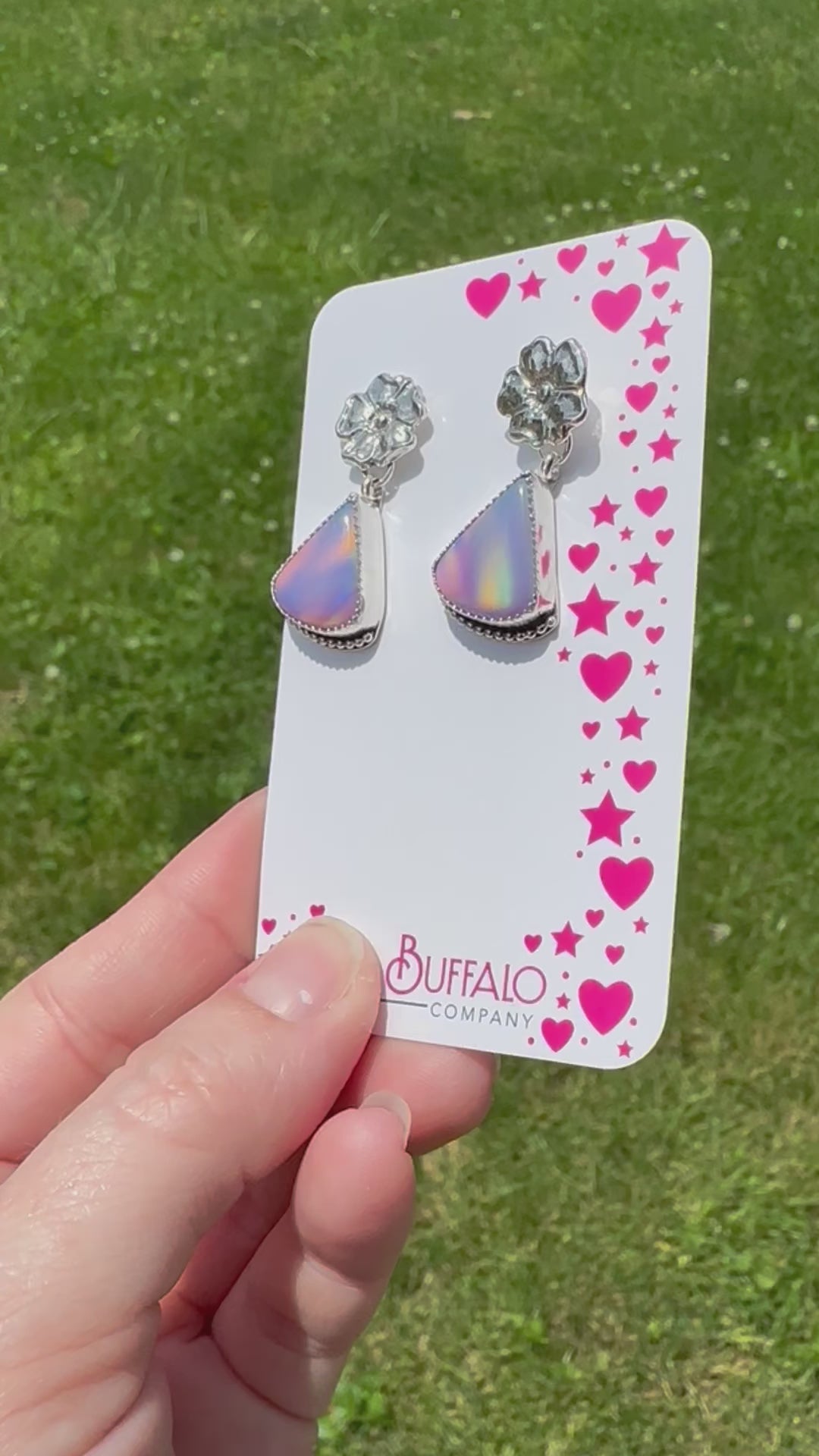 Statement Aurora opal earrings with flower casting. Super flashy. Sterling silver and fine silver.