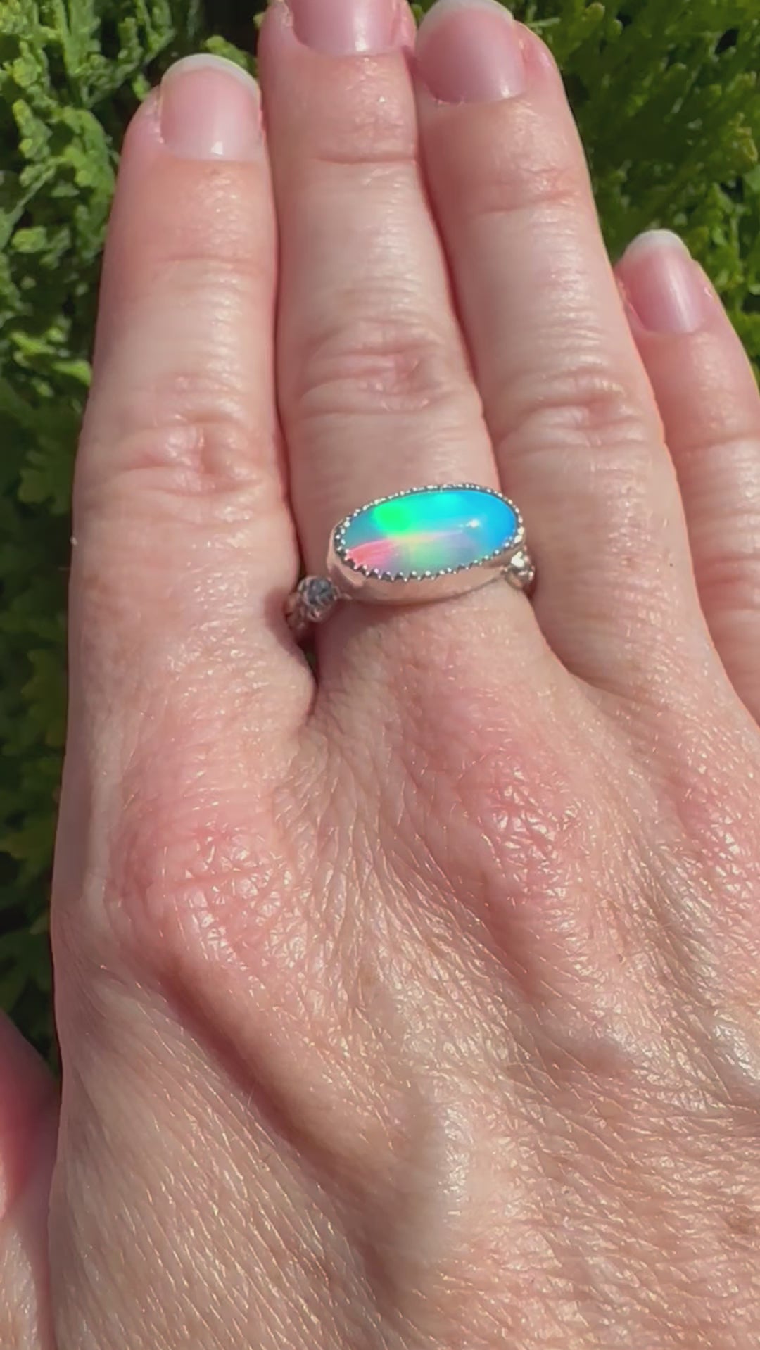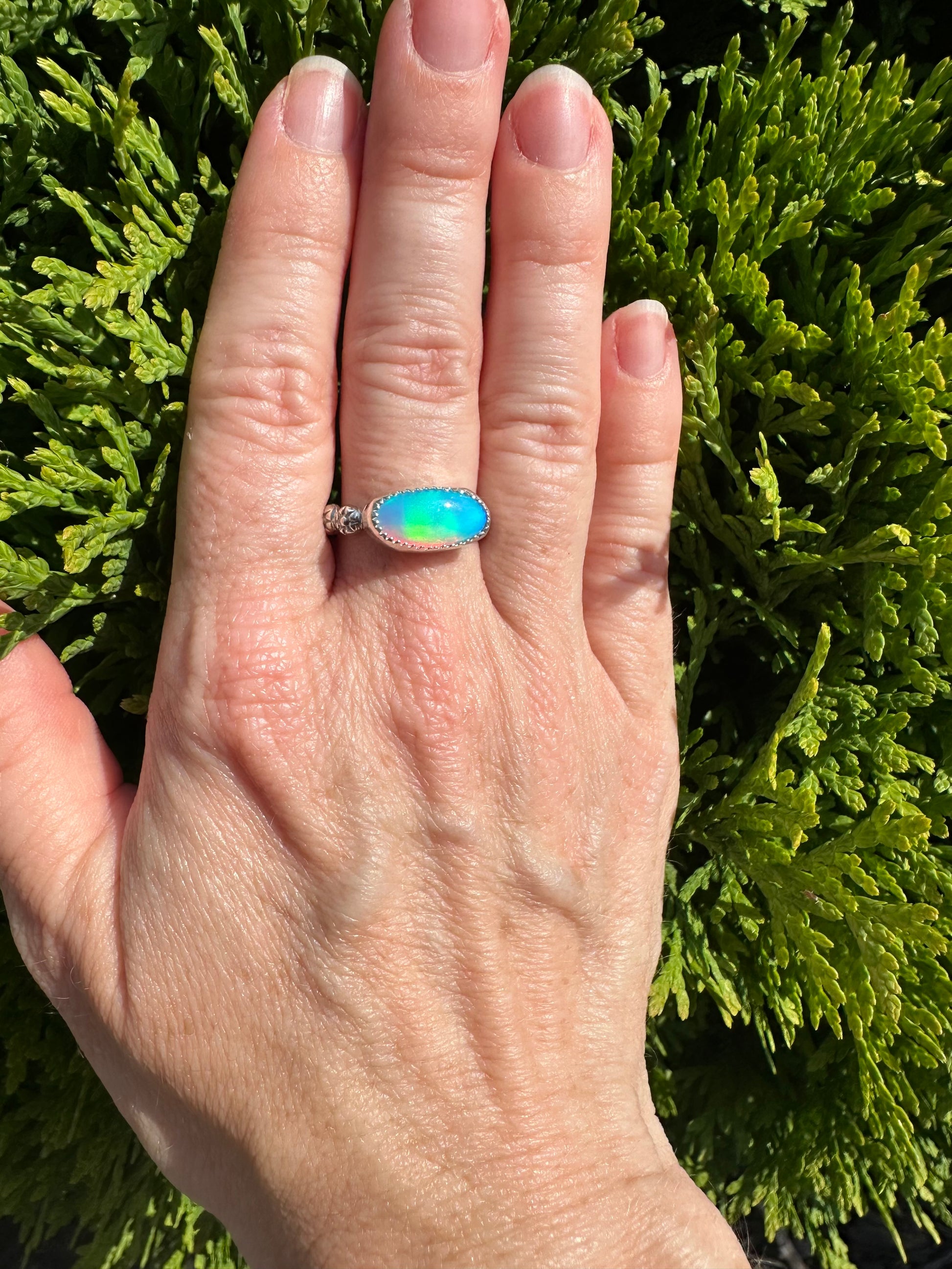Aurora opal with daisy band. Sterling and fine silver. Size 7