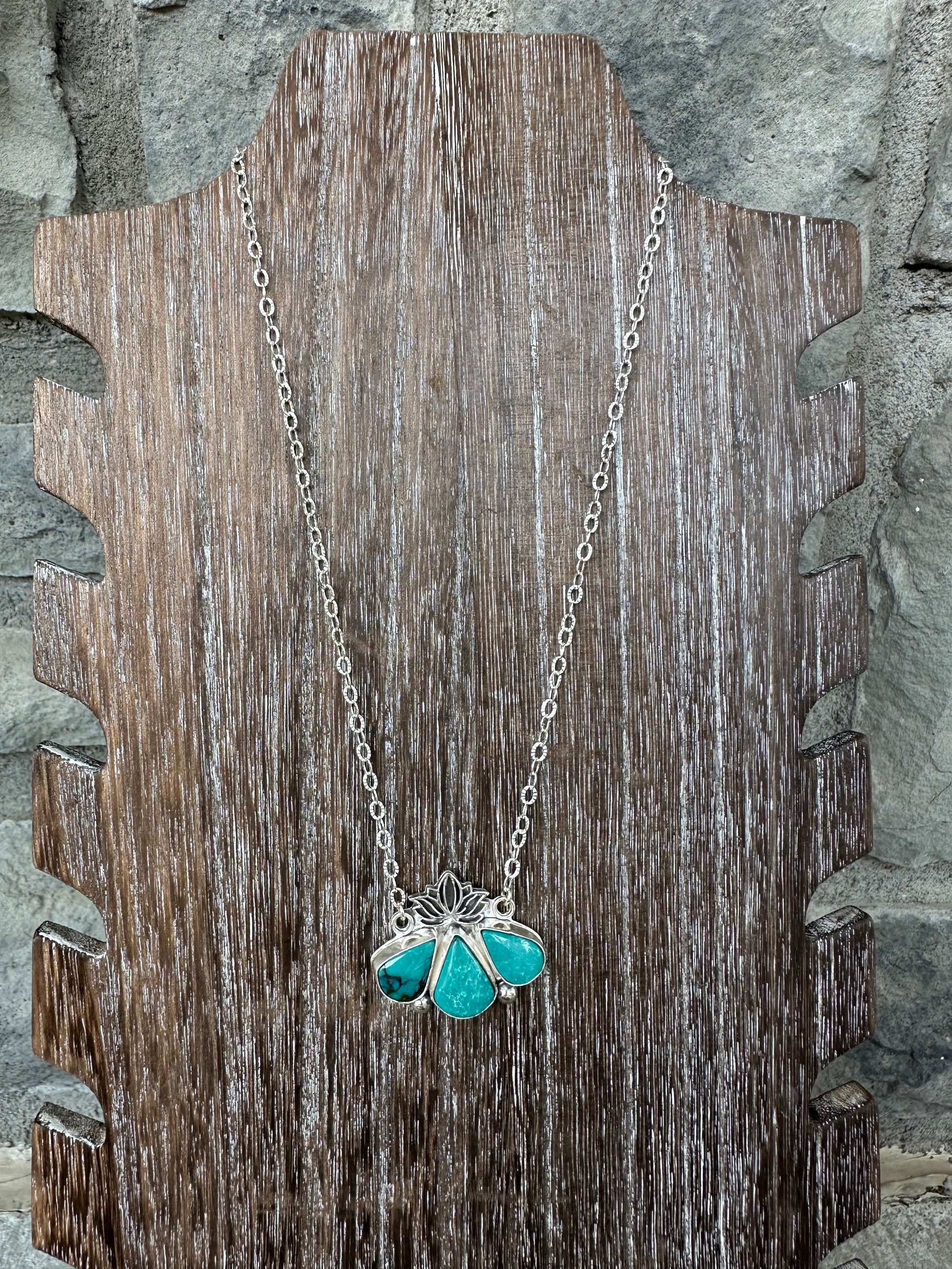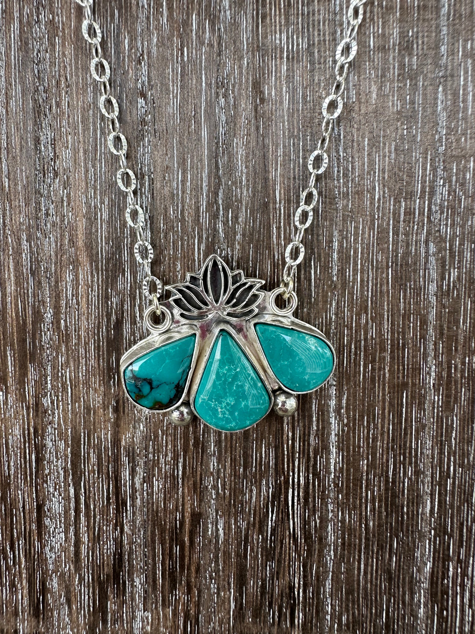 Three Bamboo Mountain turquoise stones with lotus flower casting. Sterling silver chain. Made from sterling and fine silver