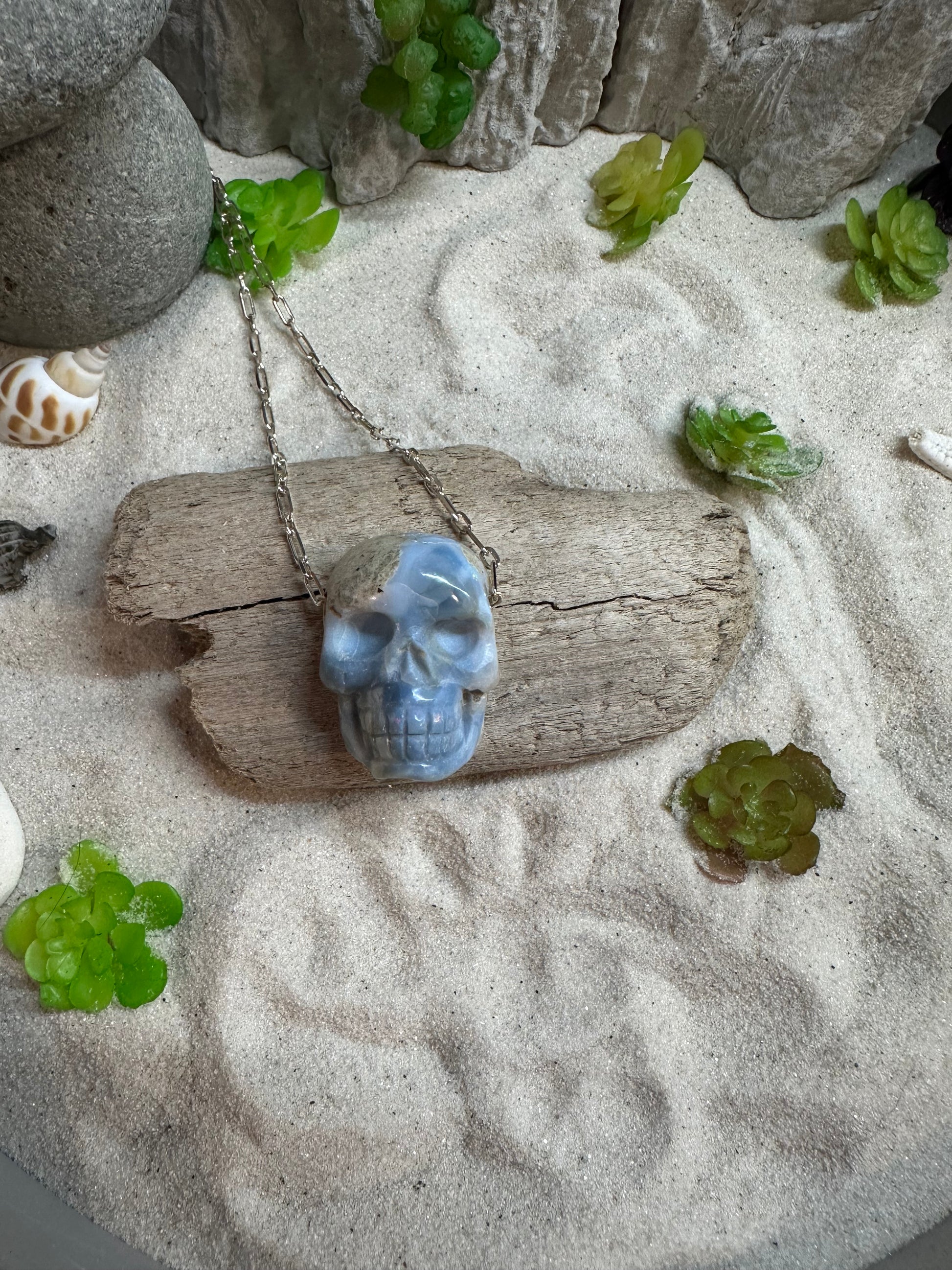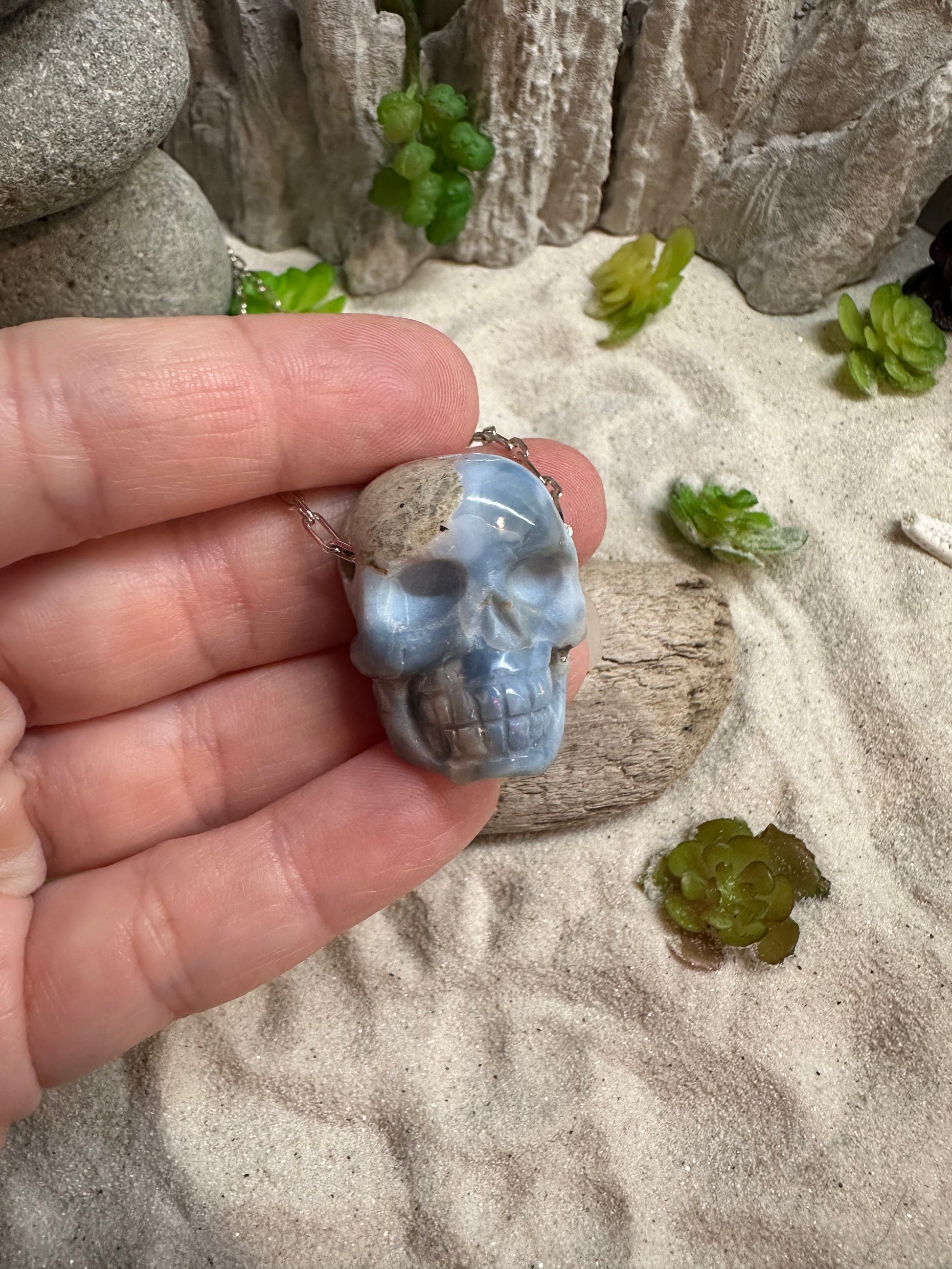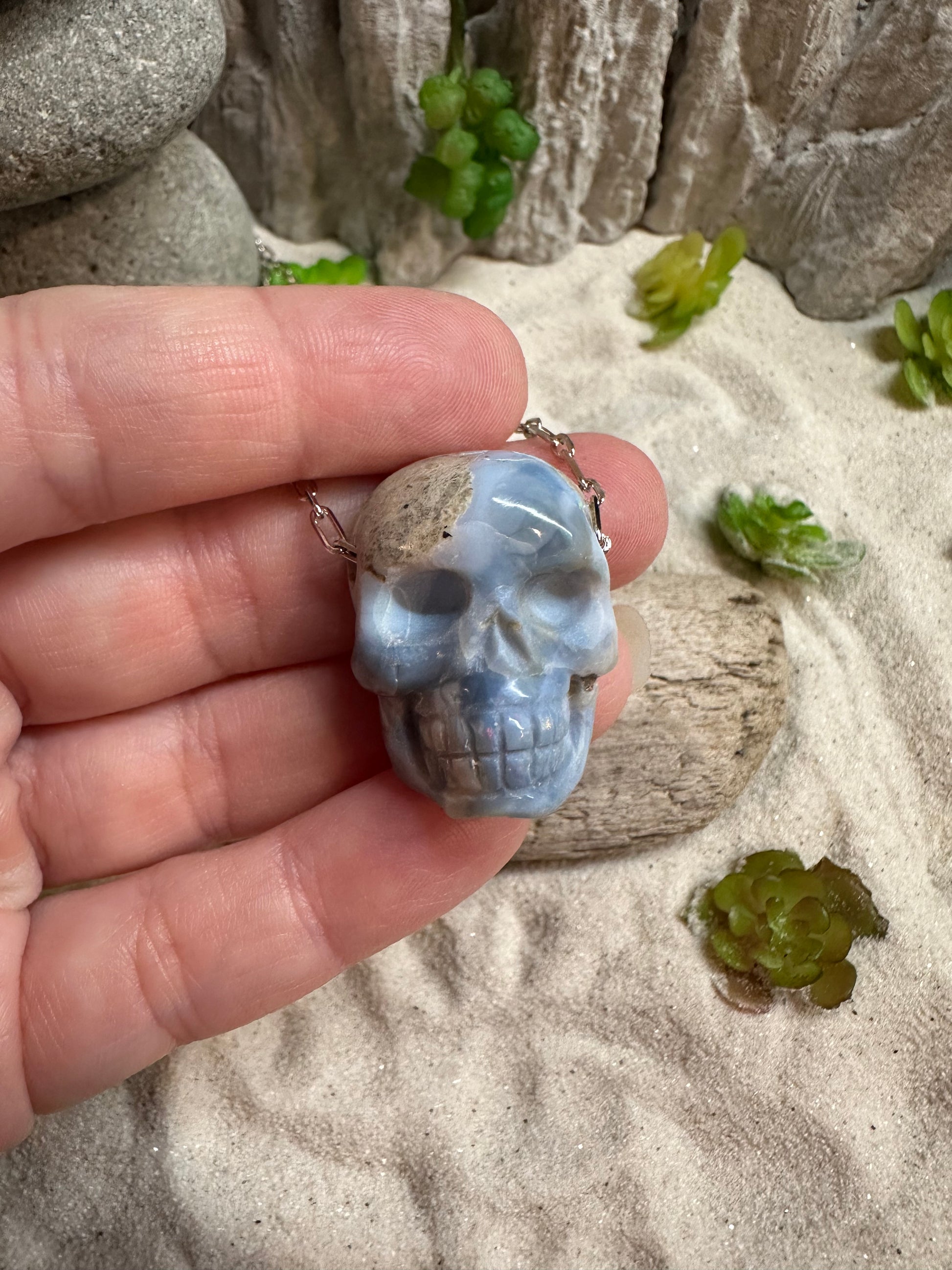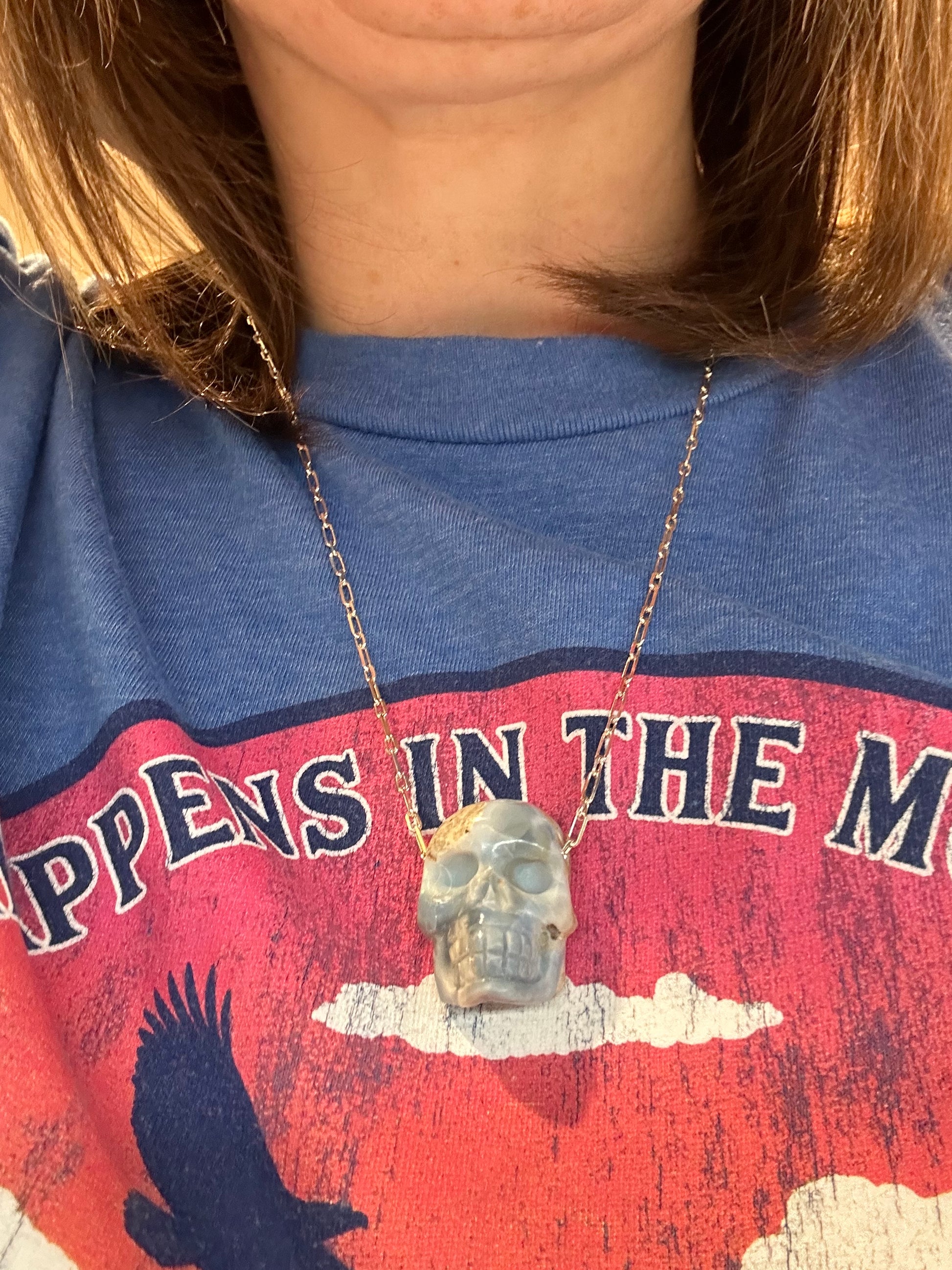 Mexican Fire Opal Carved into a Skull. Flat back. Comes on a 16 inch sterling silver chain.