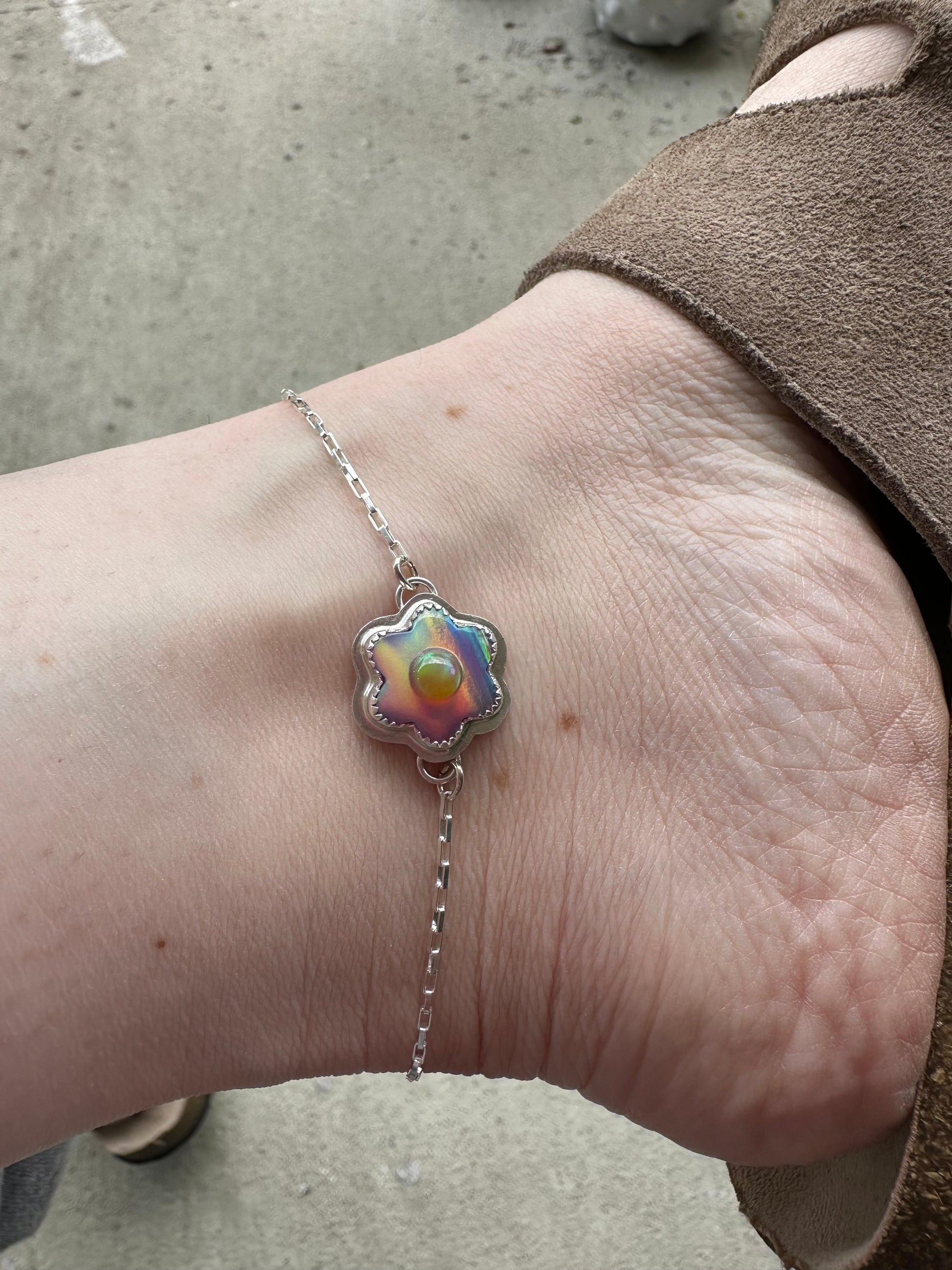 Aurora opal flower anklet. Made from sterling silver and fine silver. Anklet measures 9 inches in length. Can be made shorter upon request, just leave size you want at checkout.