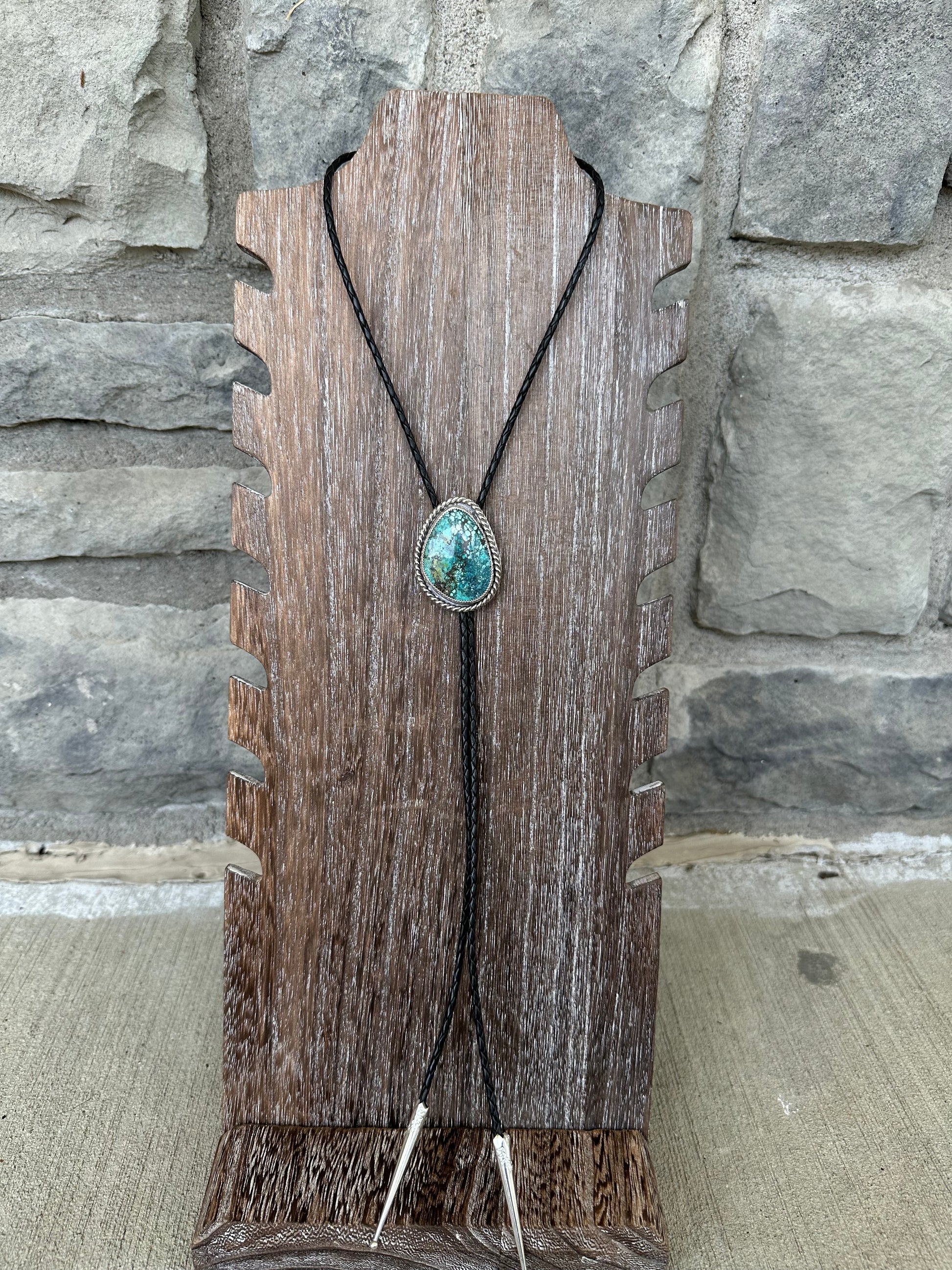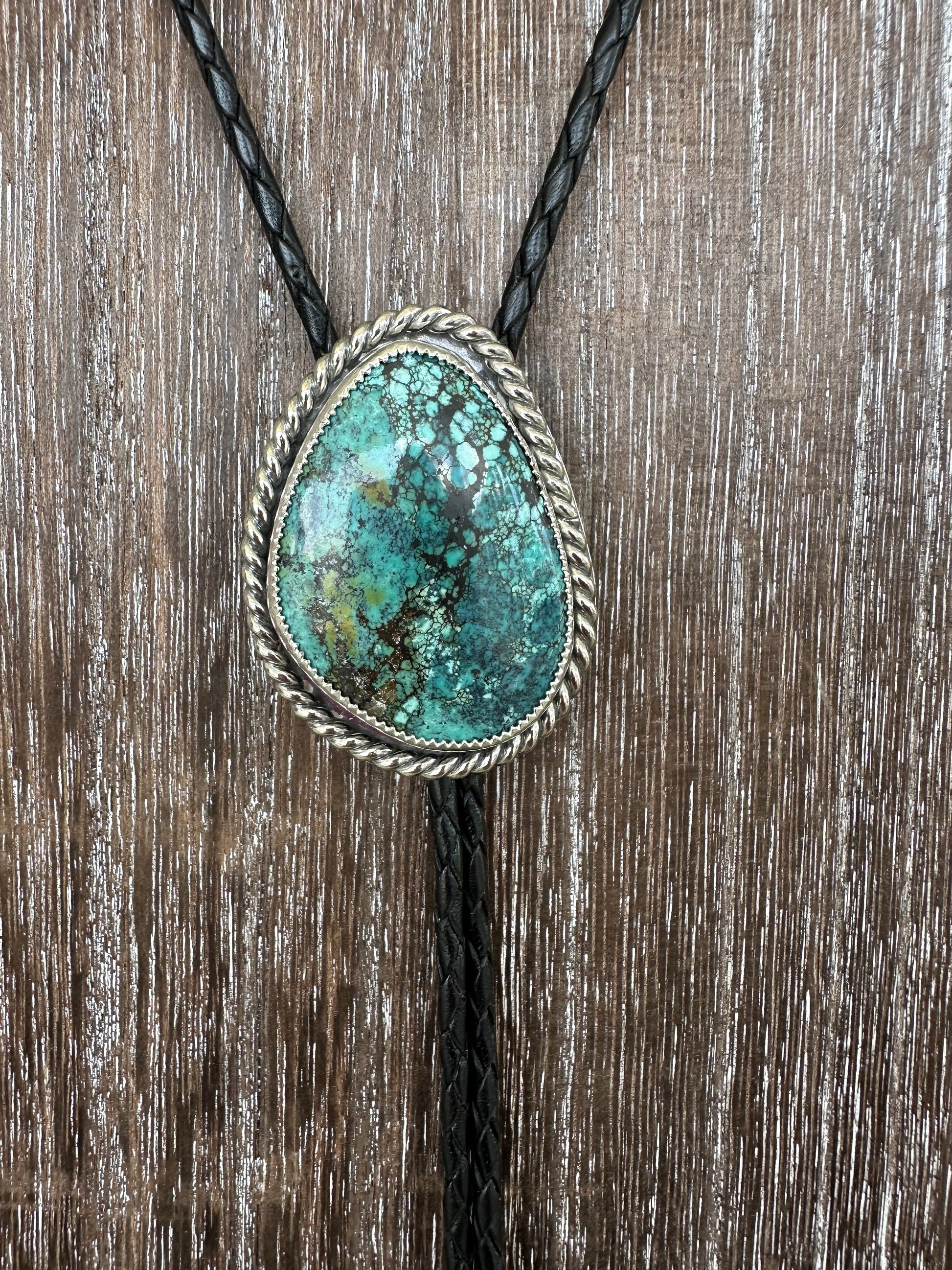 Massive High Grade Hubei stone with chunky twist wire around the stone. This bolo is adjustable and made from real leather, Sterling silver and fine silver.