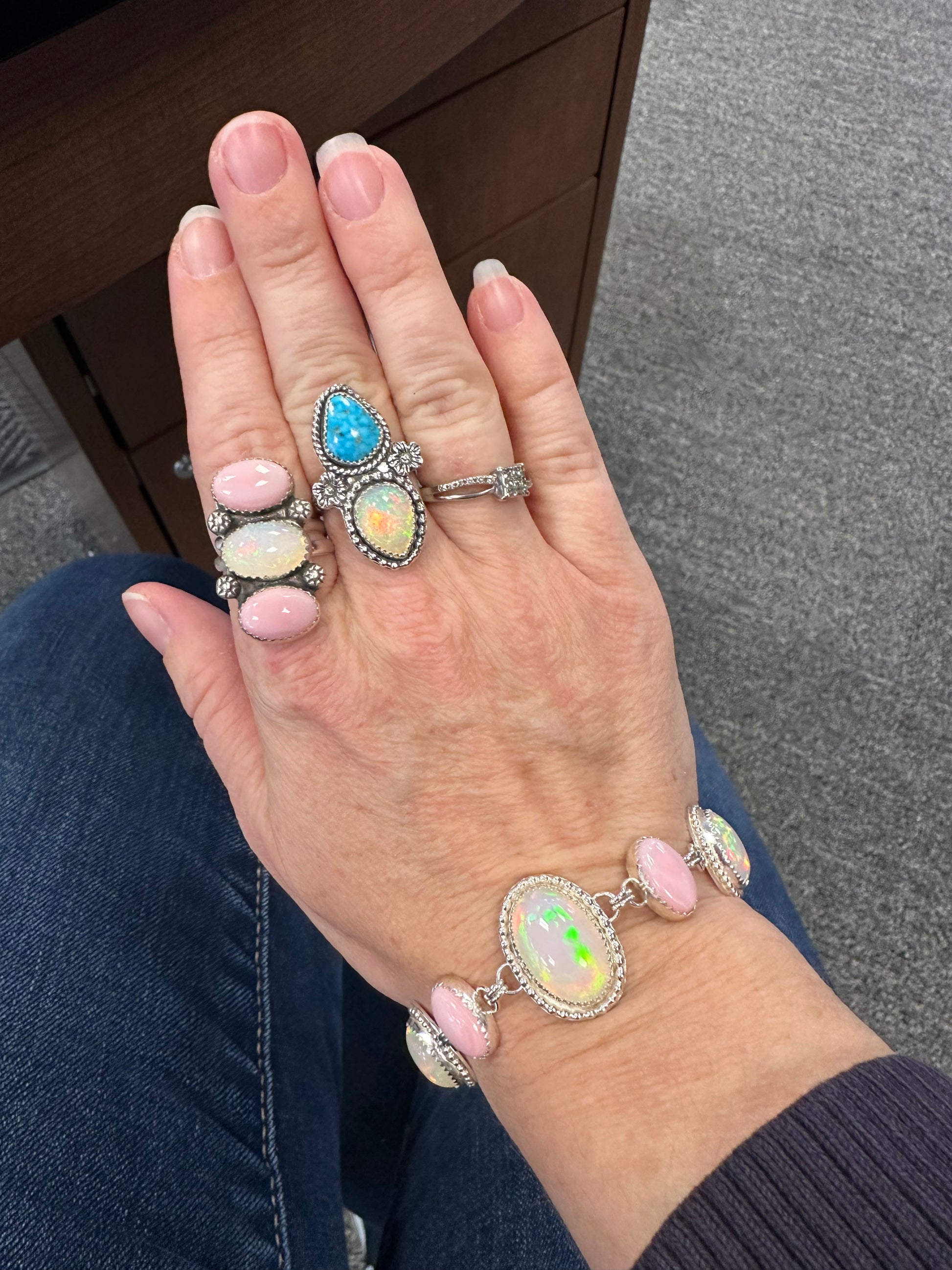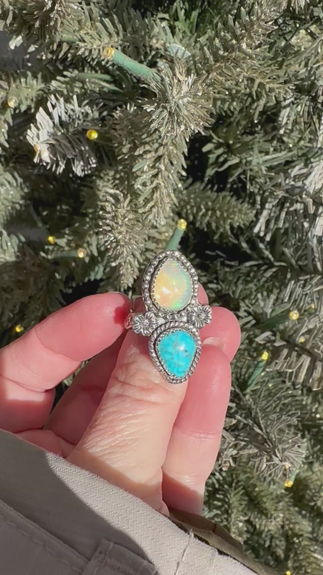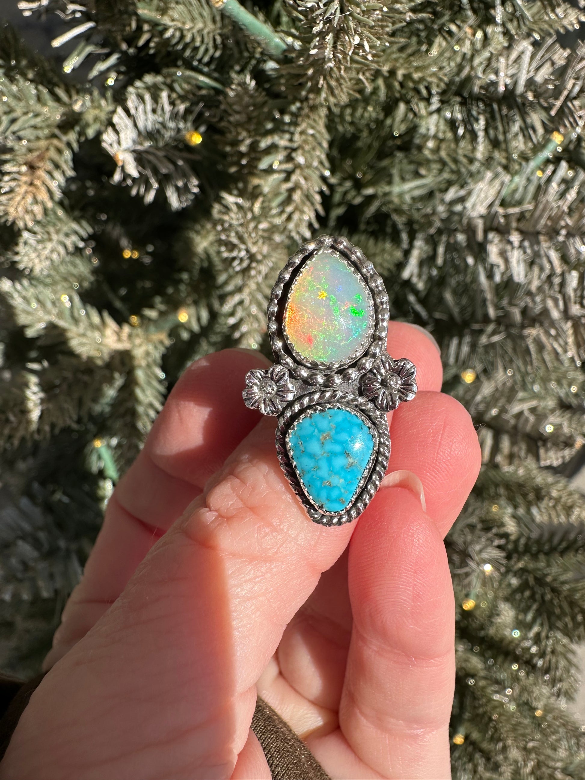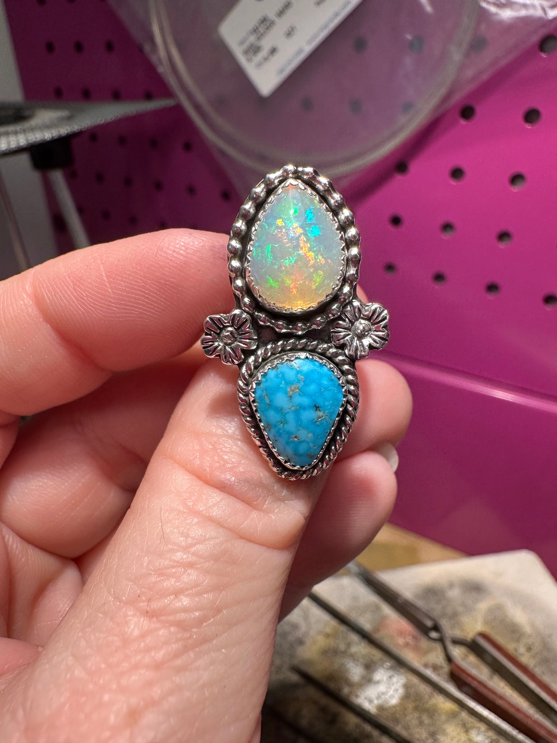 STUNNING Opal with Kingman turquoise. This opal has lots of confetti flash and colors. Band is adjustable and is currently at a 6.5 ring size. Band features engraved detail. Sterling silver and fine silver.
