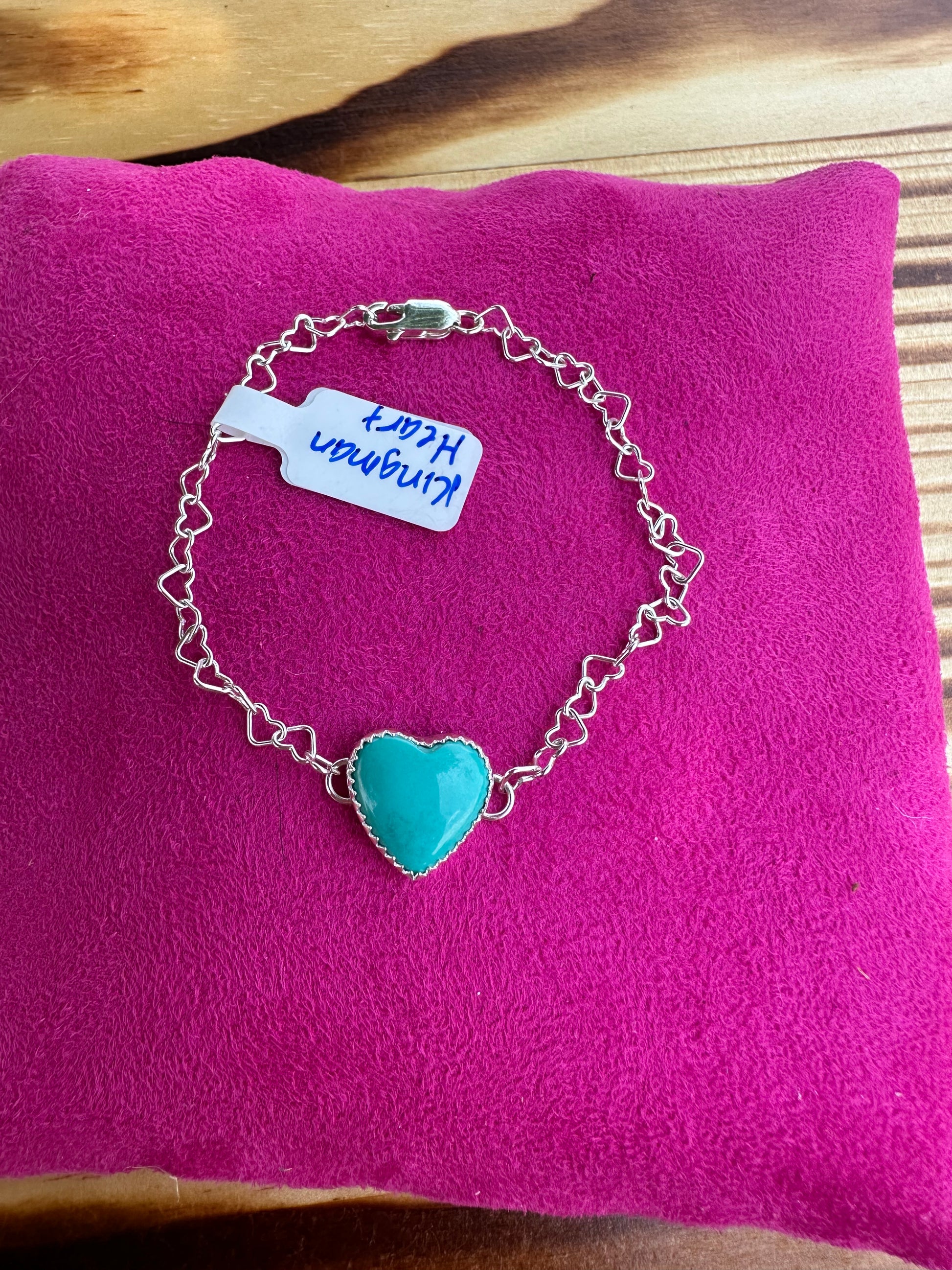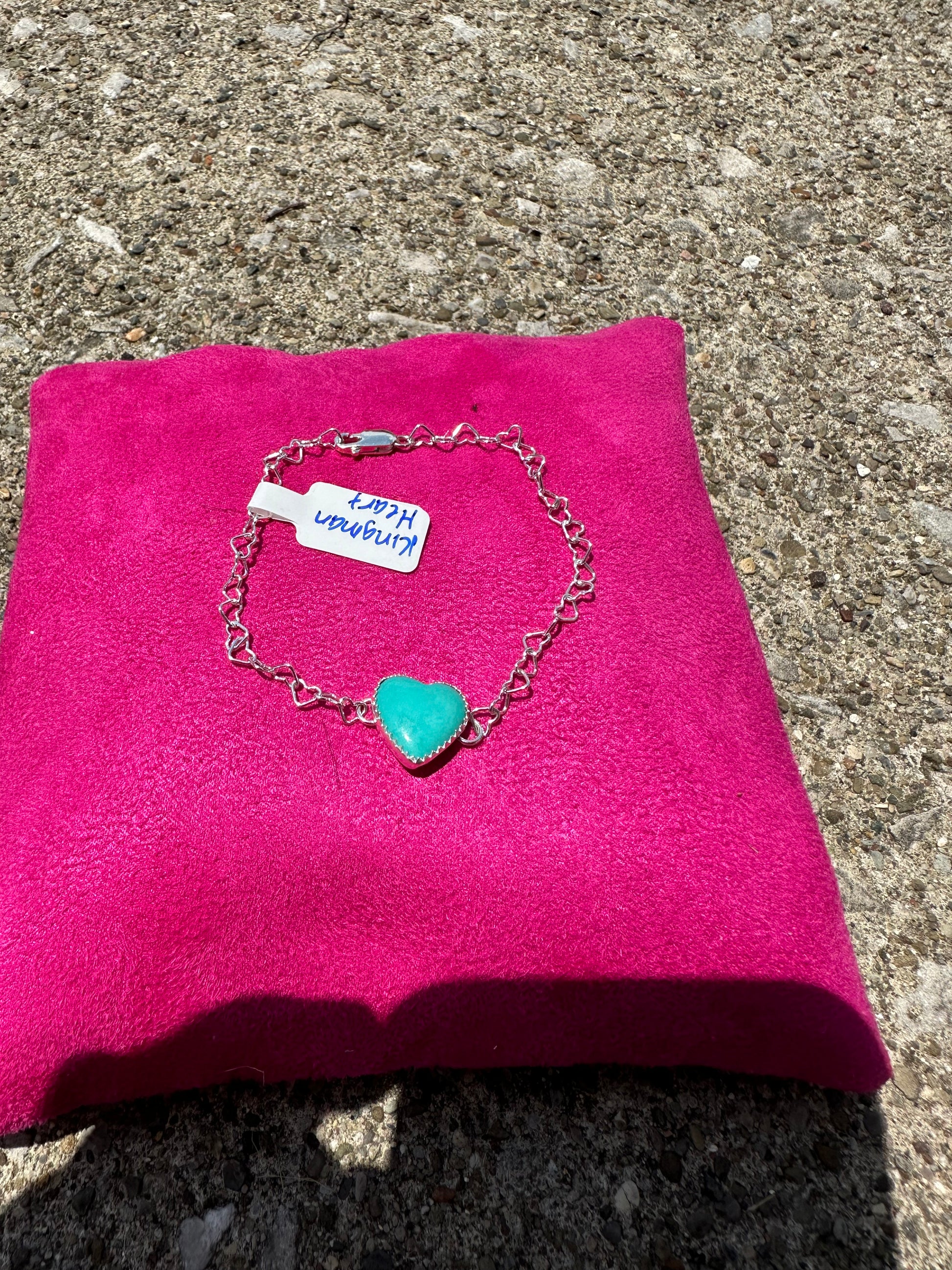Kingman heart bracelet with sterling silver heart chain. Chain is adjustable.