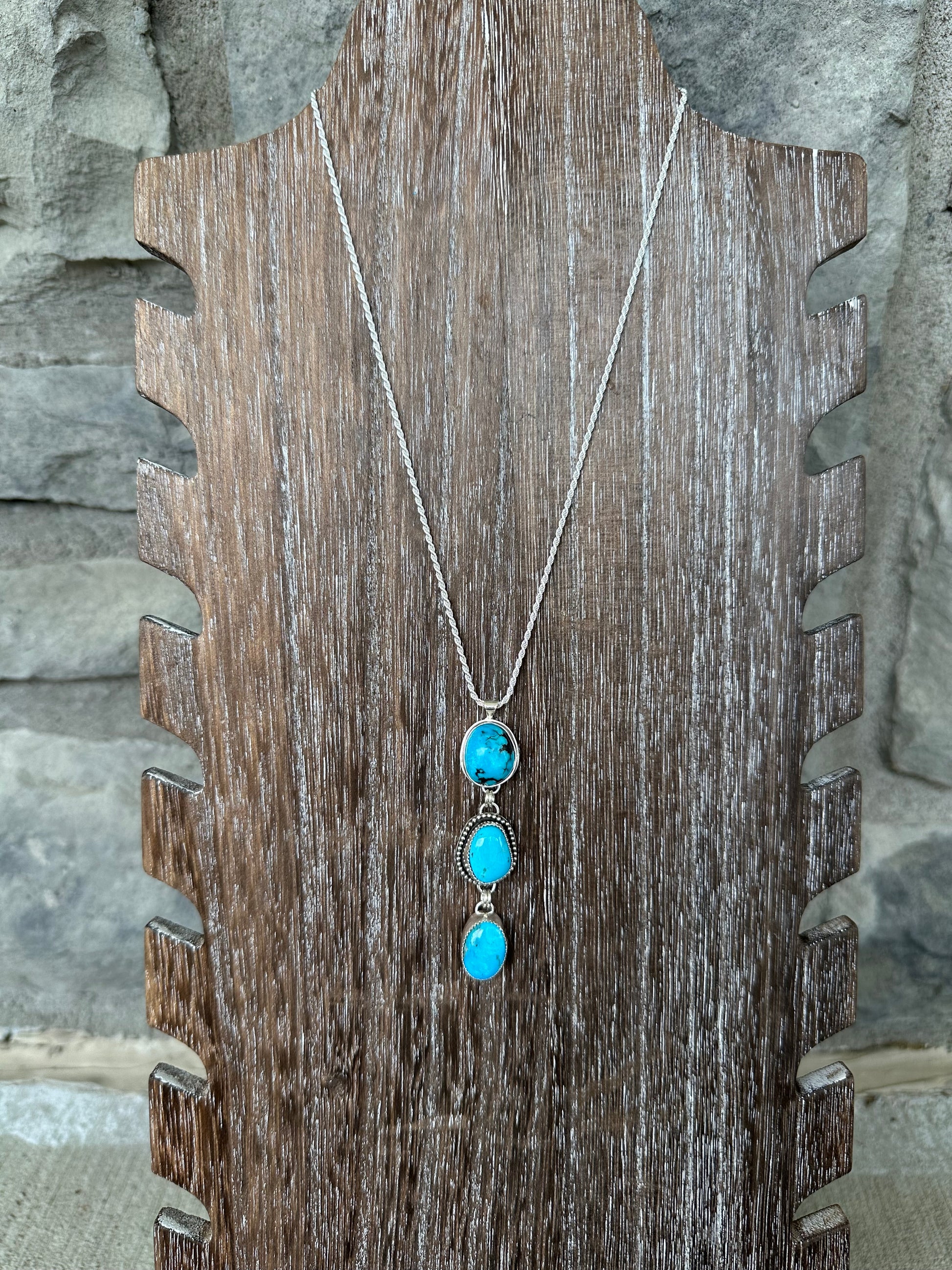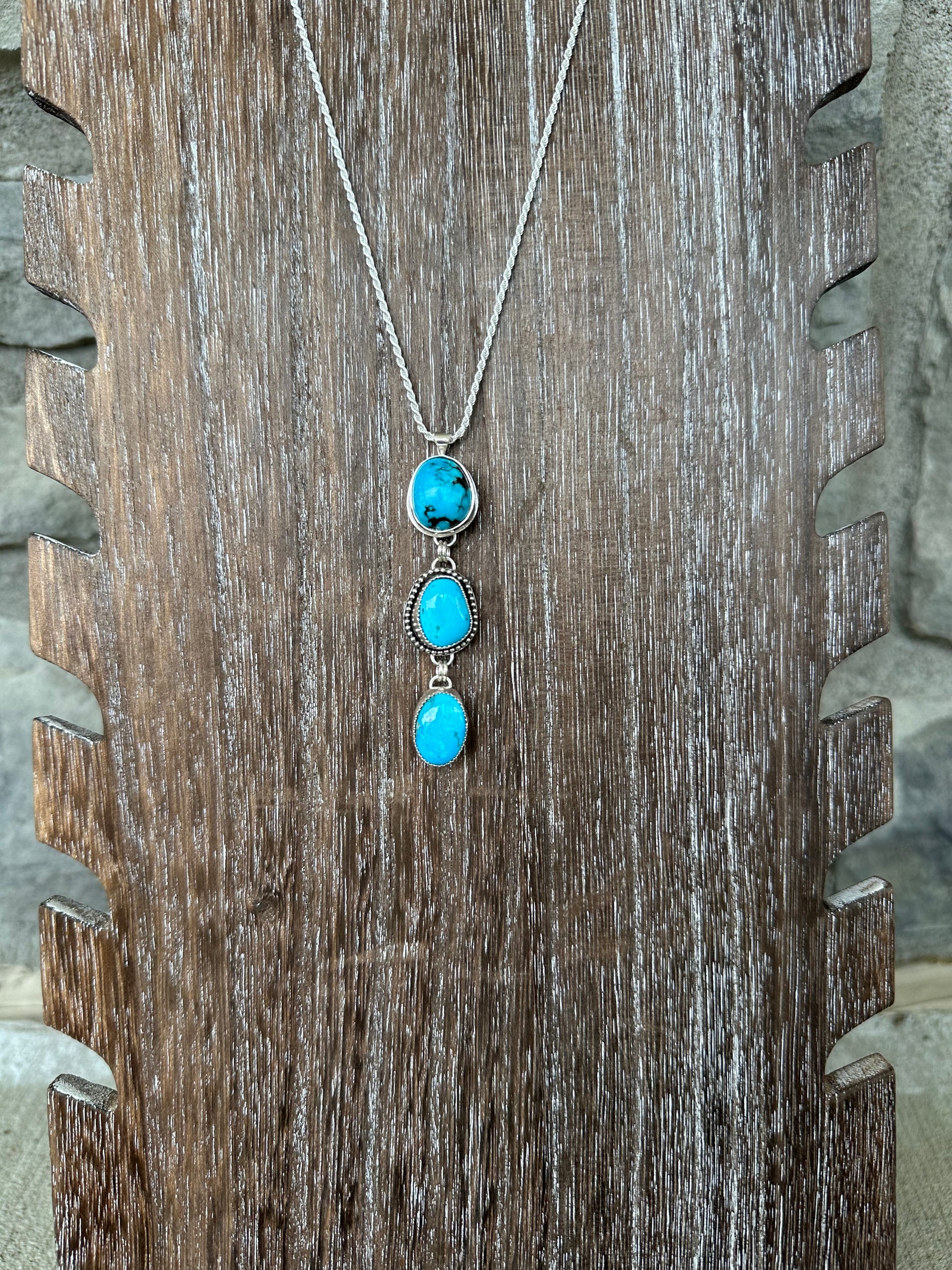 3 Kingman stones make up this beautiful Lariat necklace and comes on a sterling silver chain. Sterling and fine silver