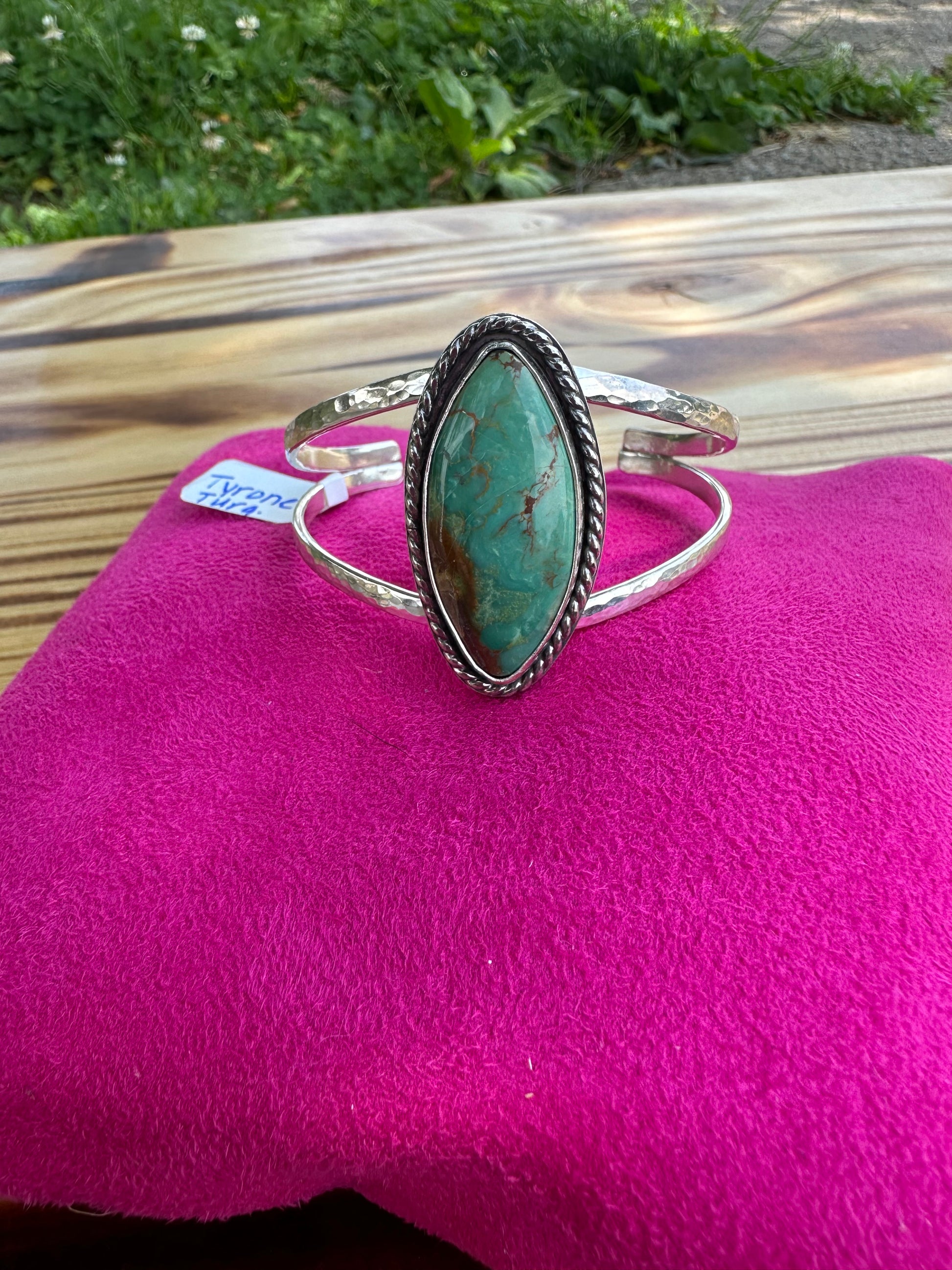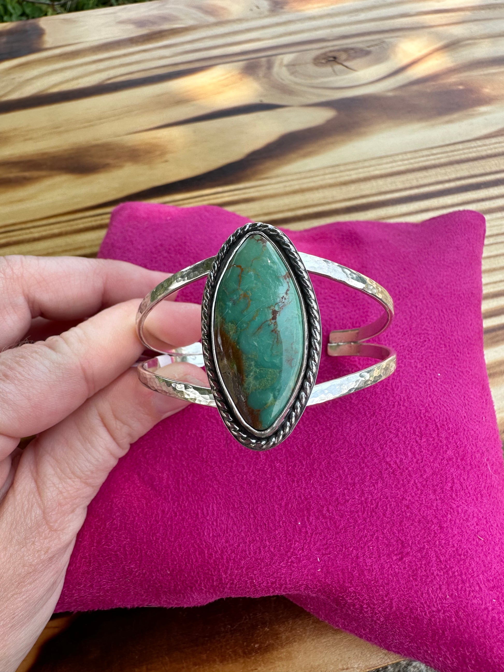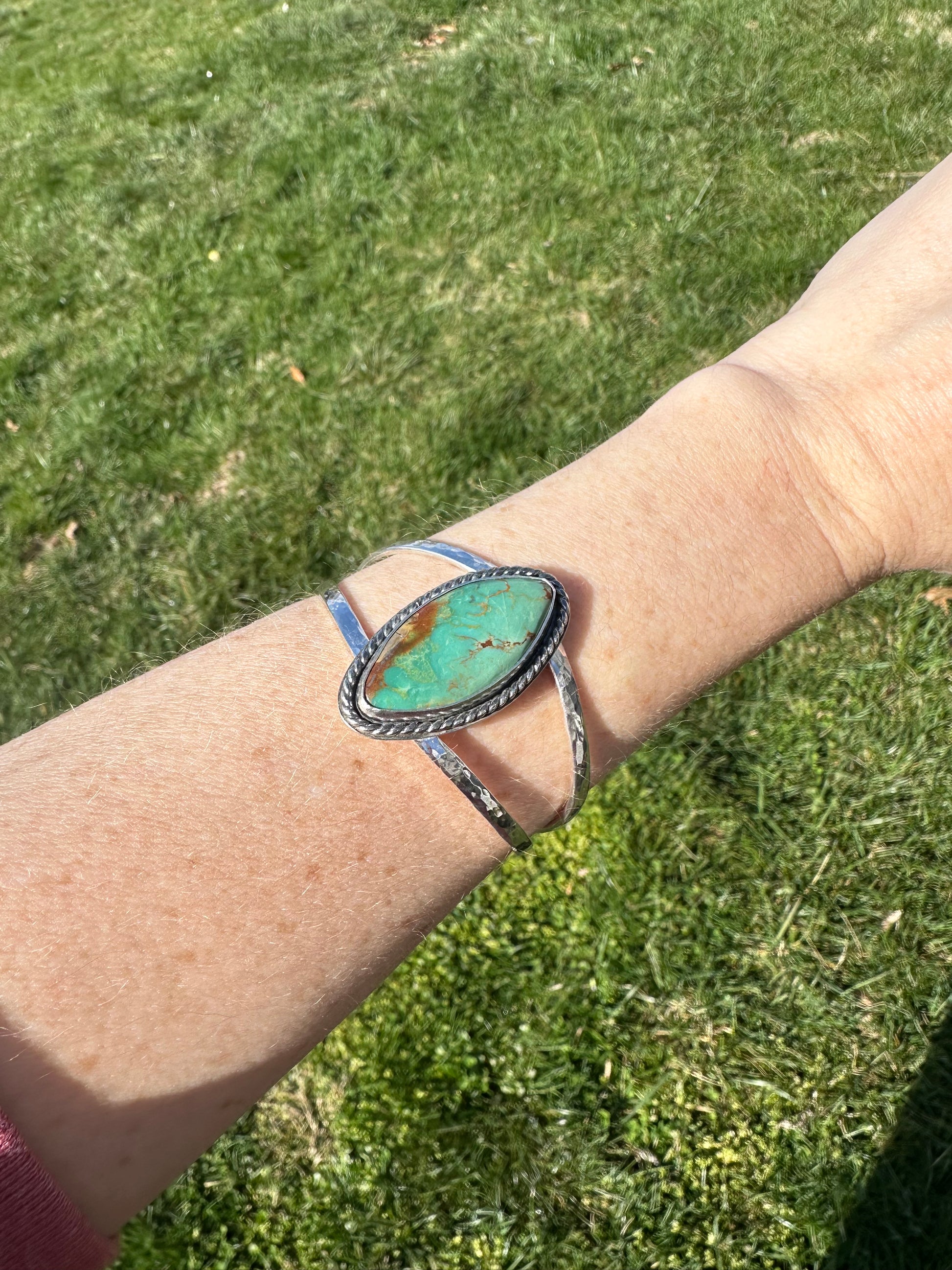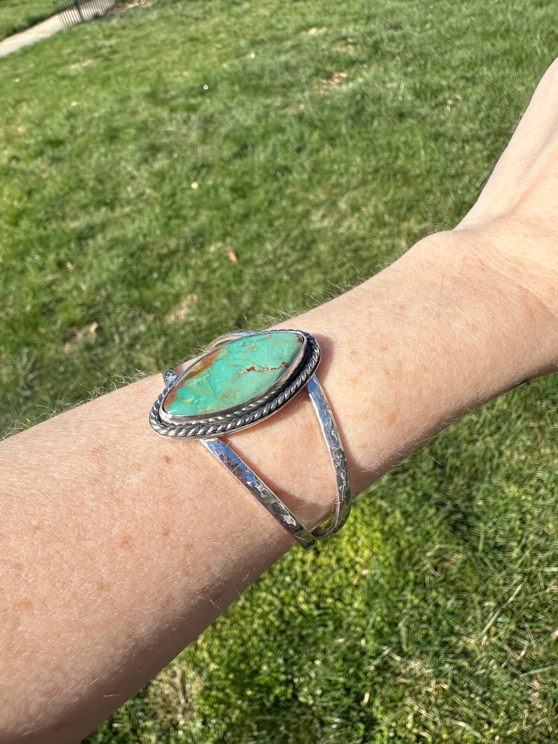 Large Tyrone Turquoise Split cuff. Fits a 6.5 wrist best with 1 inch opening. Sterling silver and fine silver. Hand hammered cuff