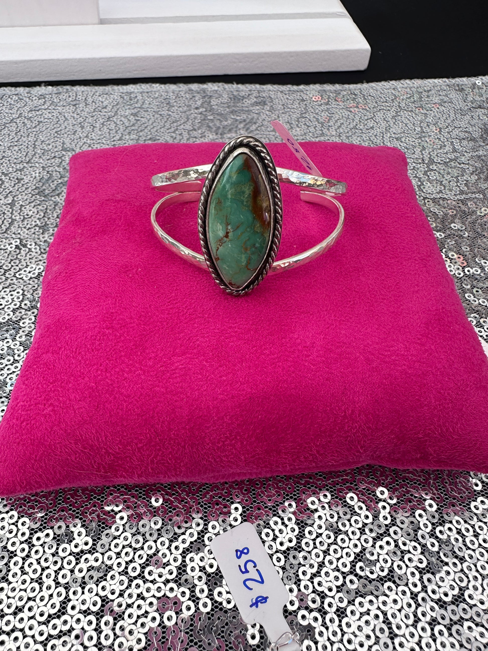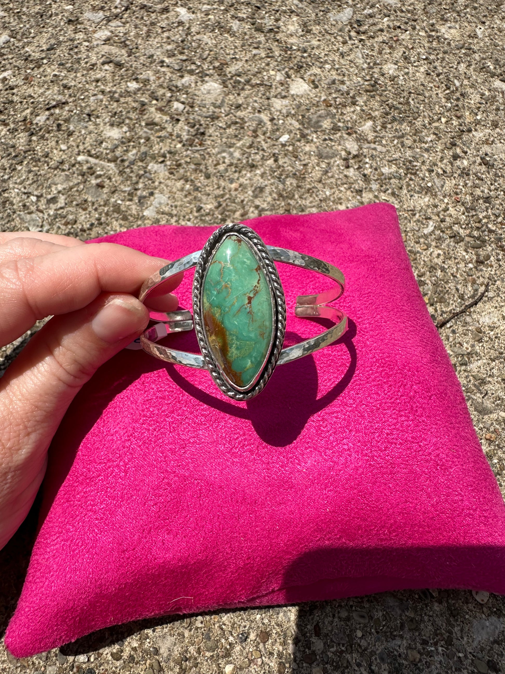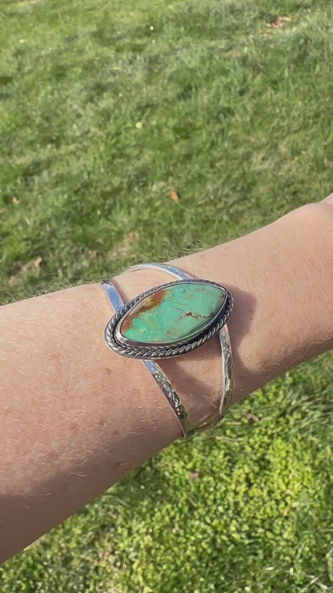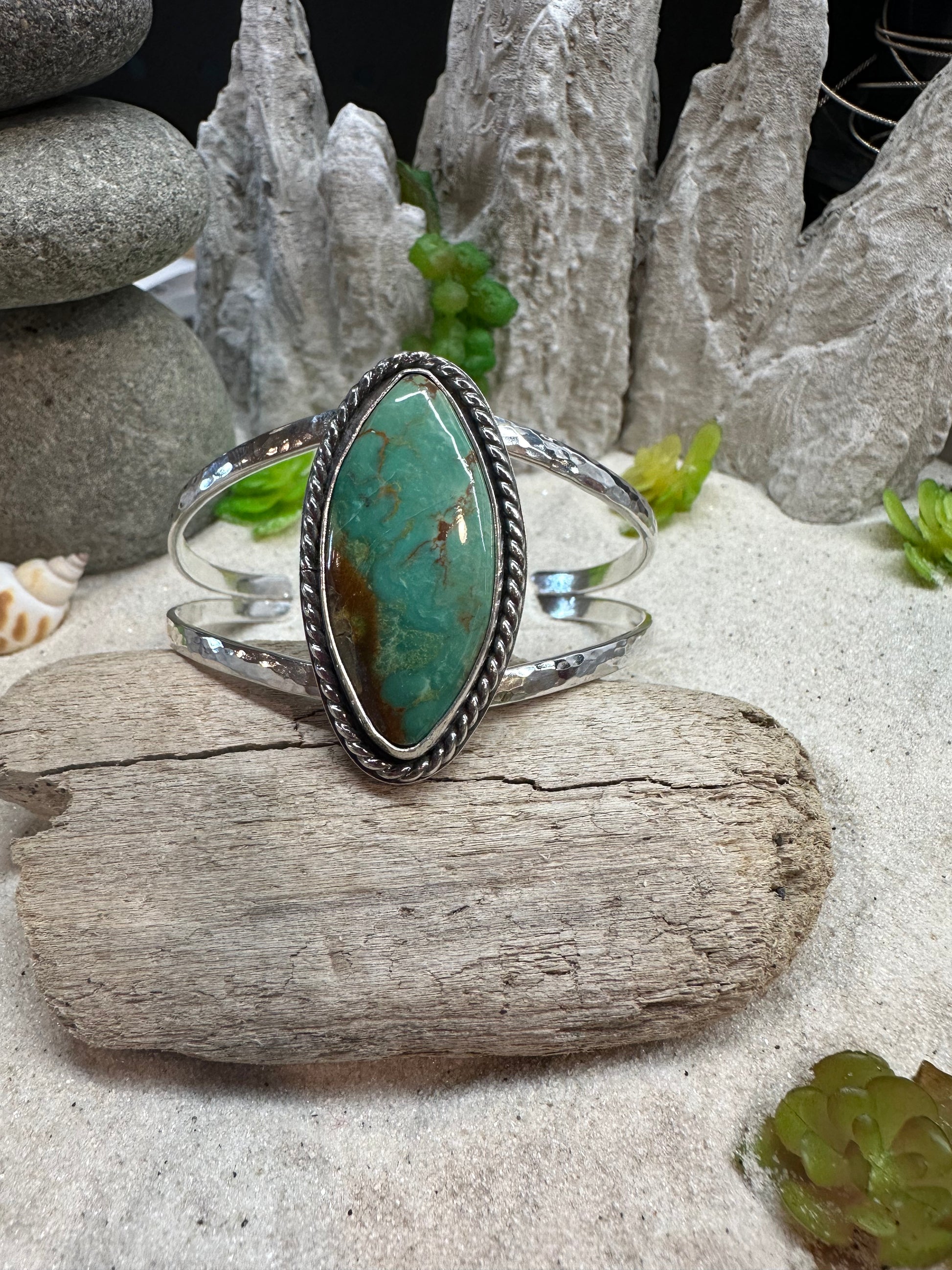 Large Tyrone Turquoise Split cuff. Fits a 6.5 wrist best with 1 inch opening. Sterling silver and fine silver. Hand hammered cuff