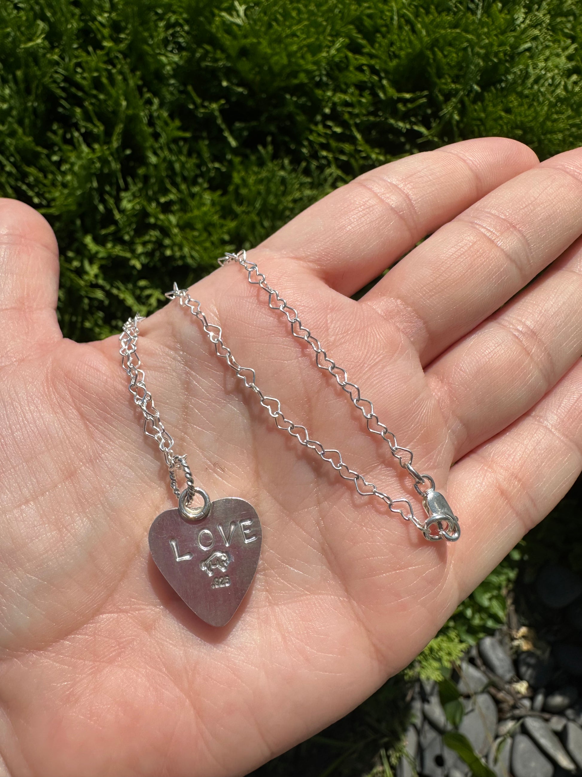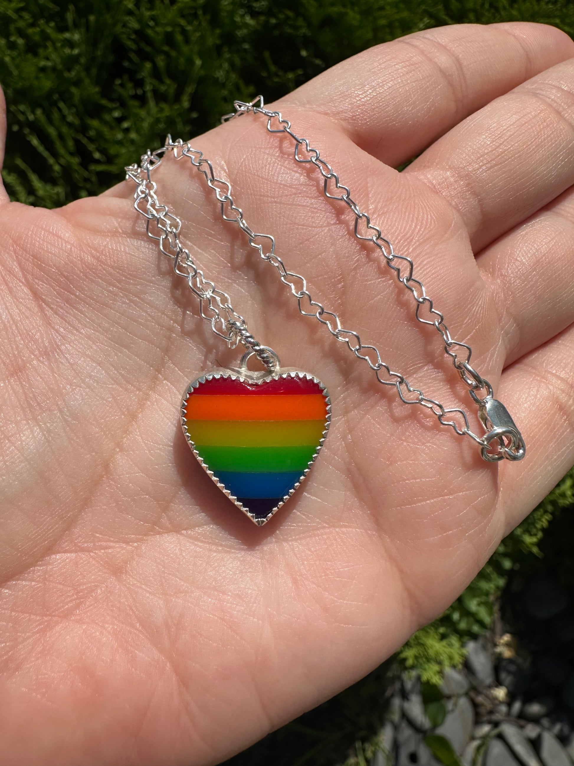 This multicolor stripe heart is made from sterling and fine silver and is stamped with my makers mark, .925 and the word LOVE on the back. Comes on a sterling silver heart chain which only seemed fitting for this heart.