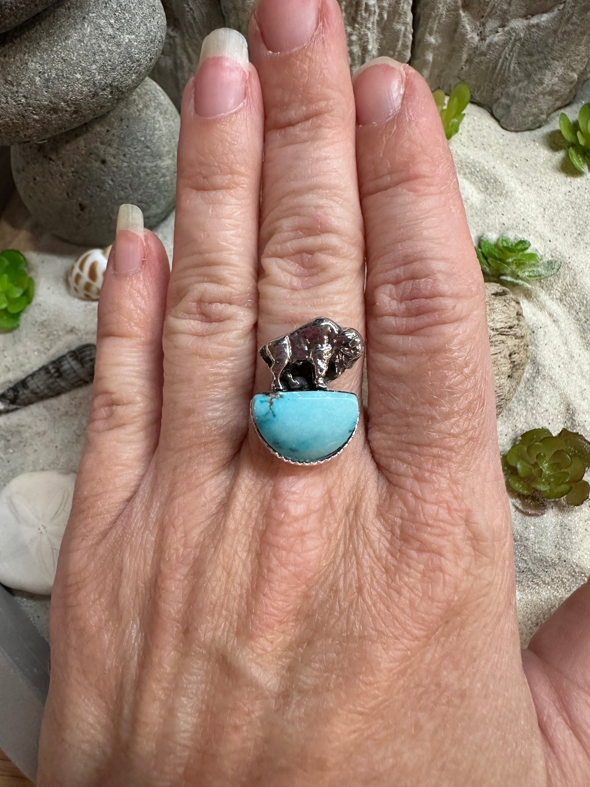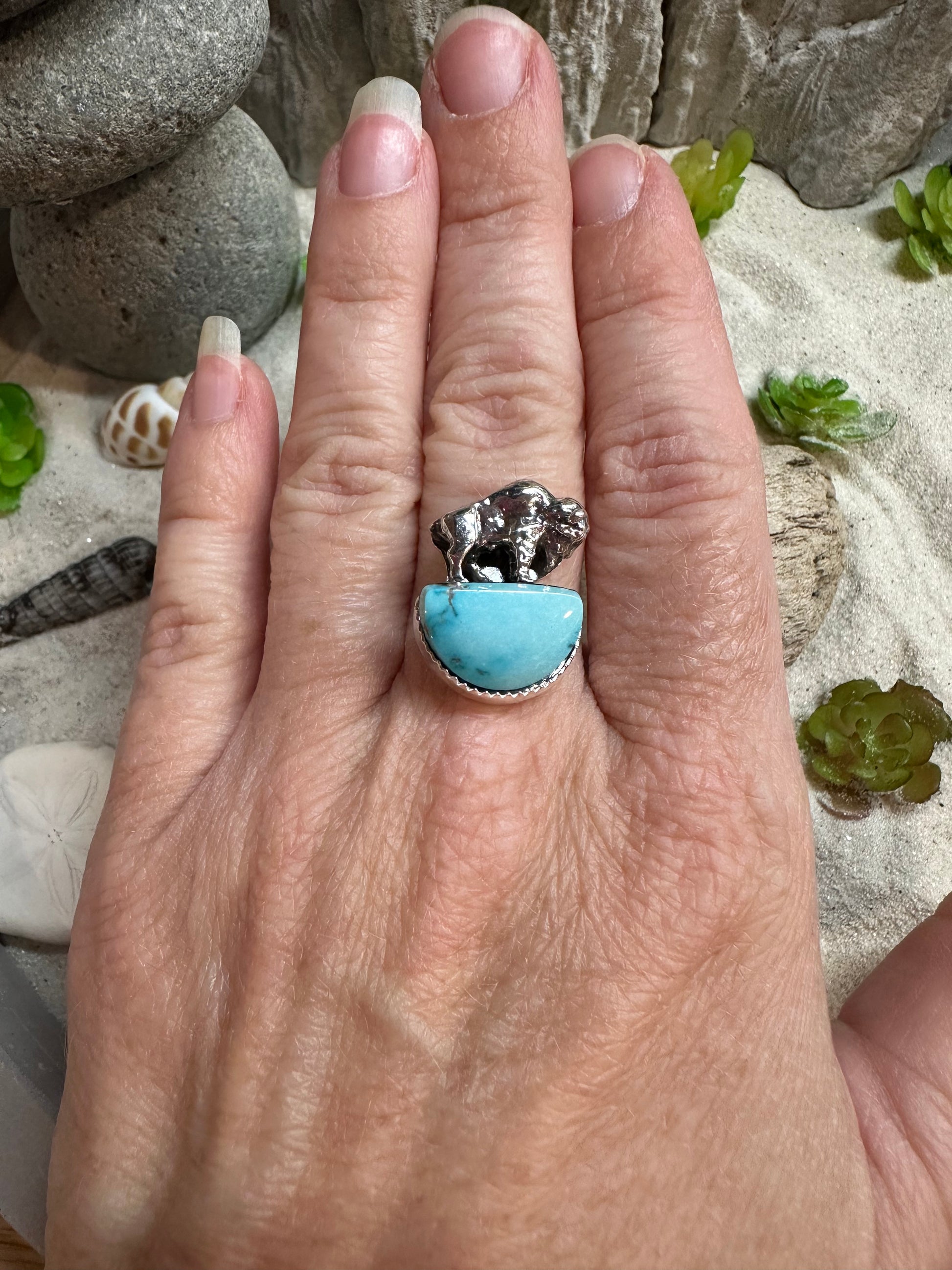This is a made to size ring featuring a Bison with Ol’ Willie turquoise. Made from Sterling silver and fine silver. Please leave ring size in comments when you check out.
