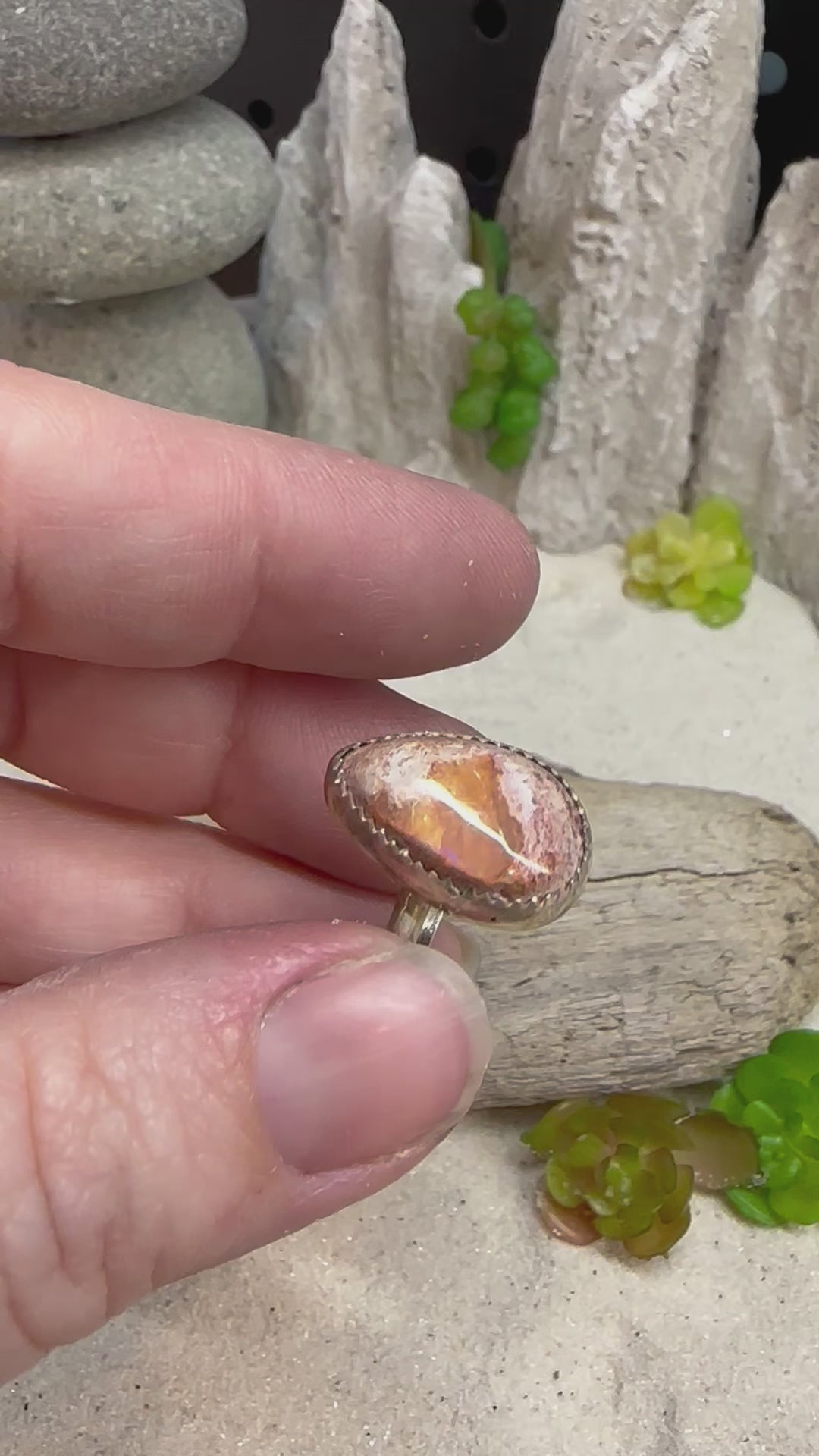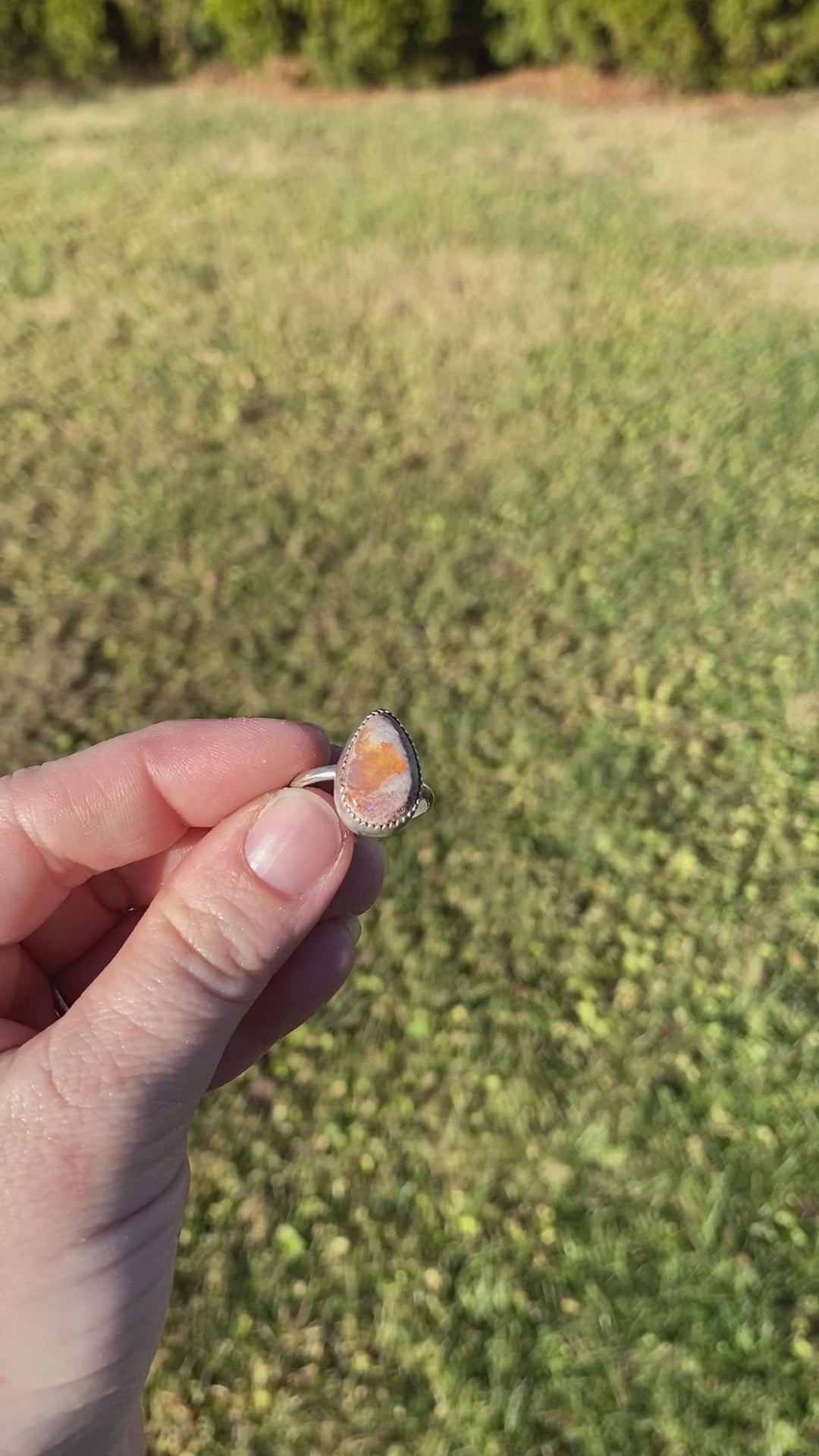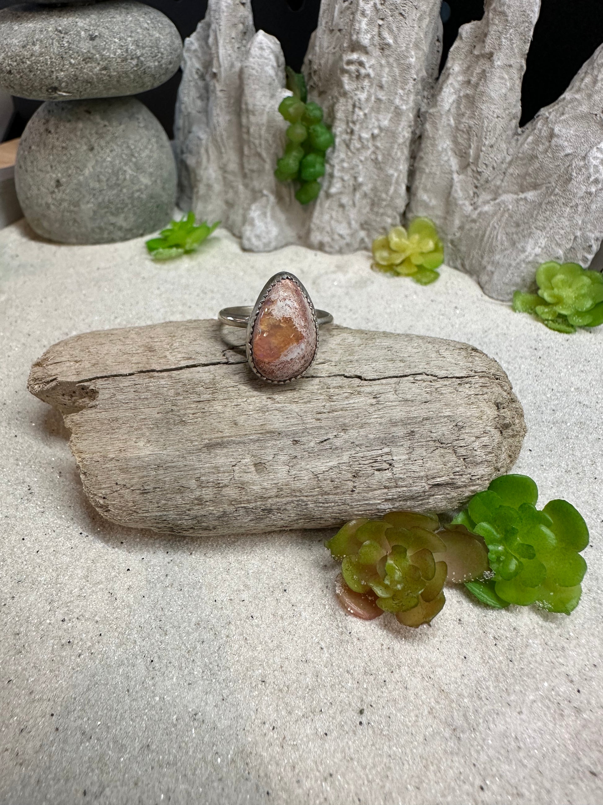 This teardrop shaped Mexican Fire Opal is a size 7 with a thin simple band. The flash and color is so pretty. This ring is a size 7