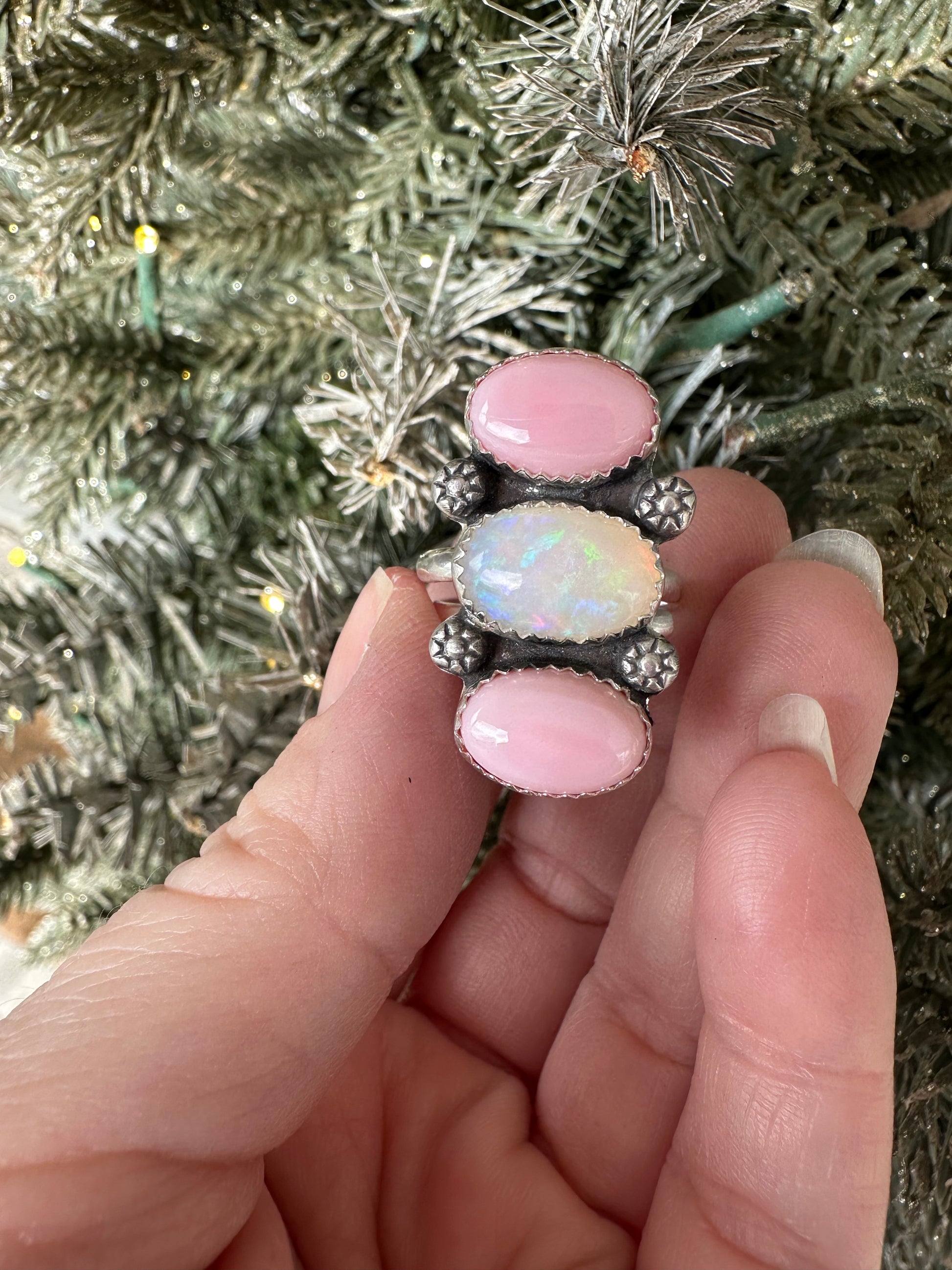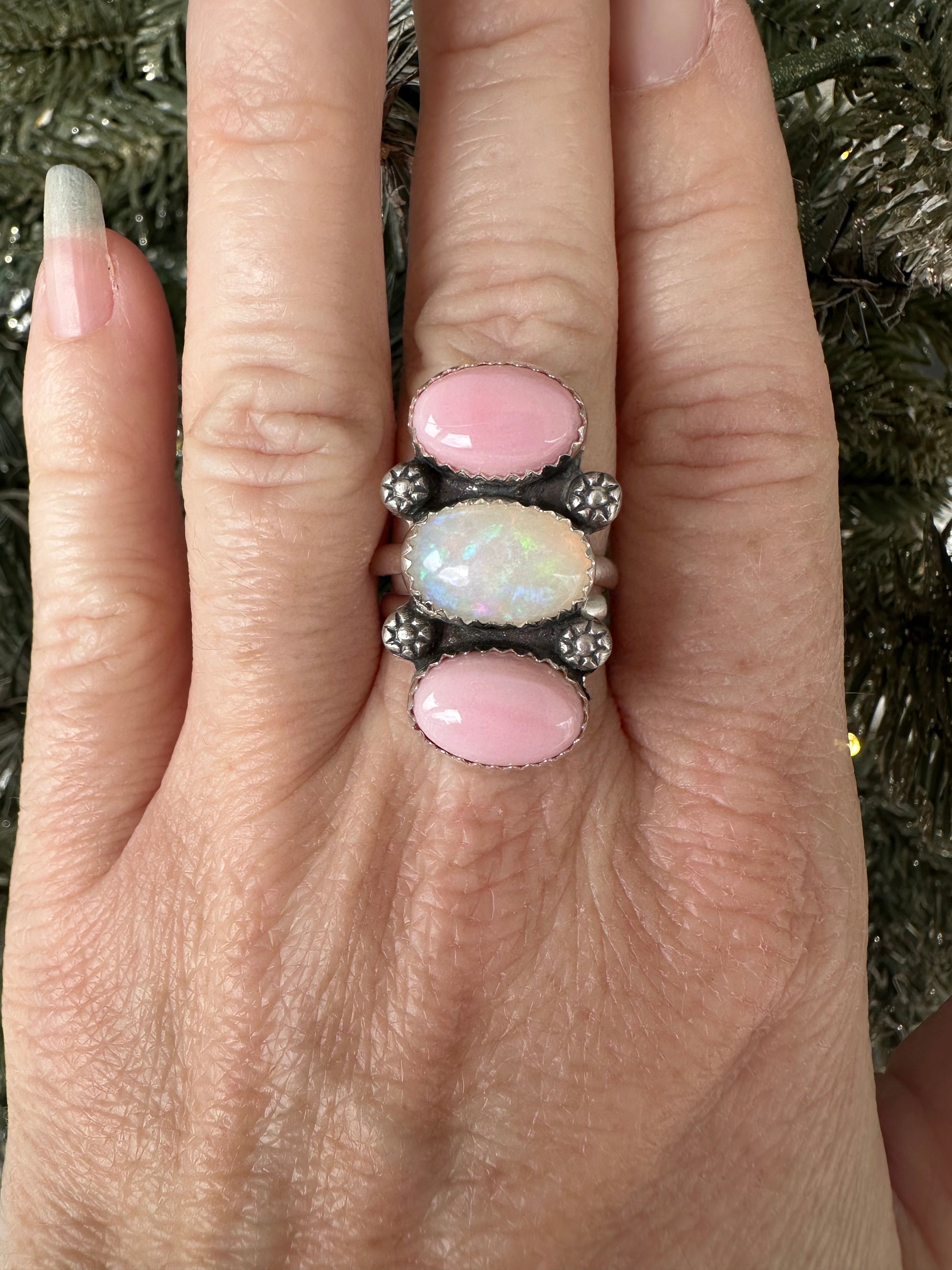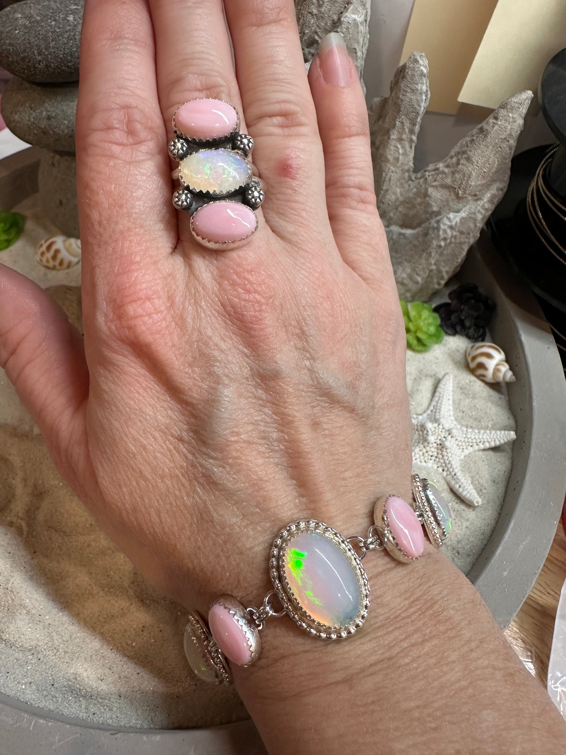 Adjustable ring currently sitting at 7.25 size. Stunning flash on this opal there is paired with 2 pink conch shells. Confetti flash on the opal with a rainbow of colors. Sterling silver and fine silver.
