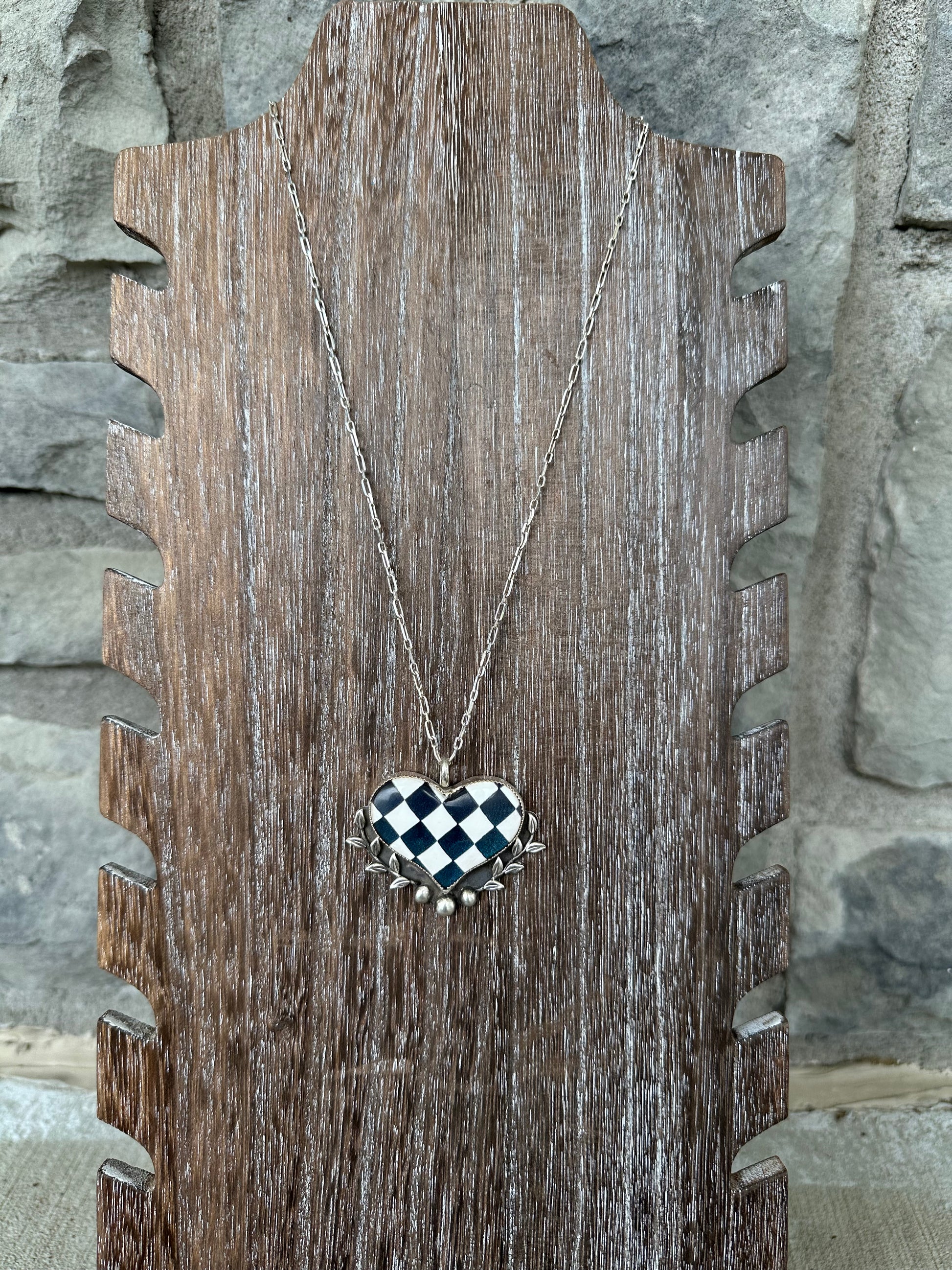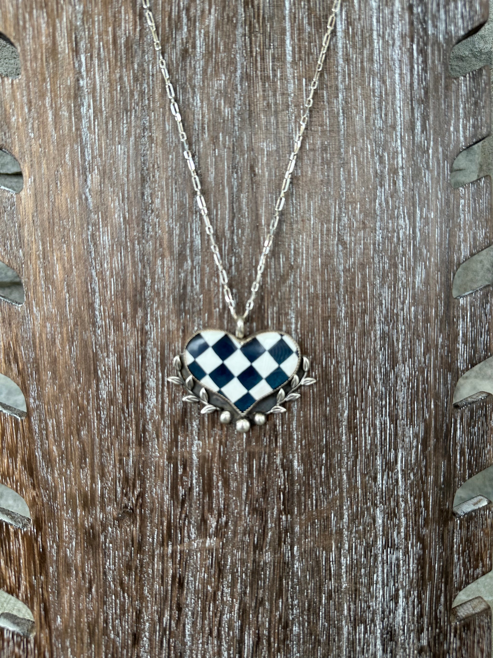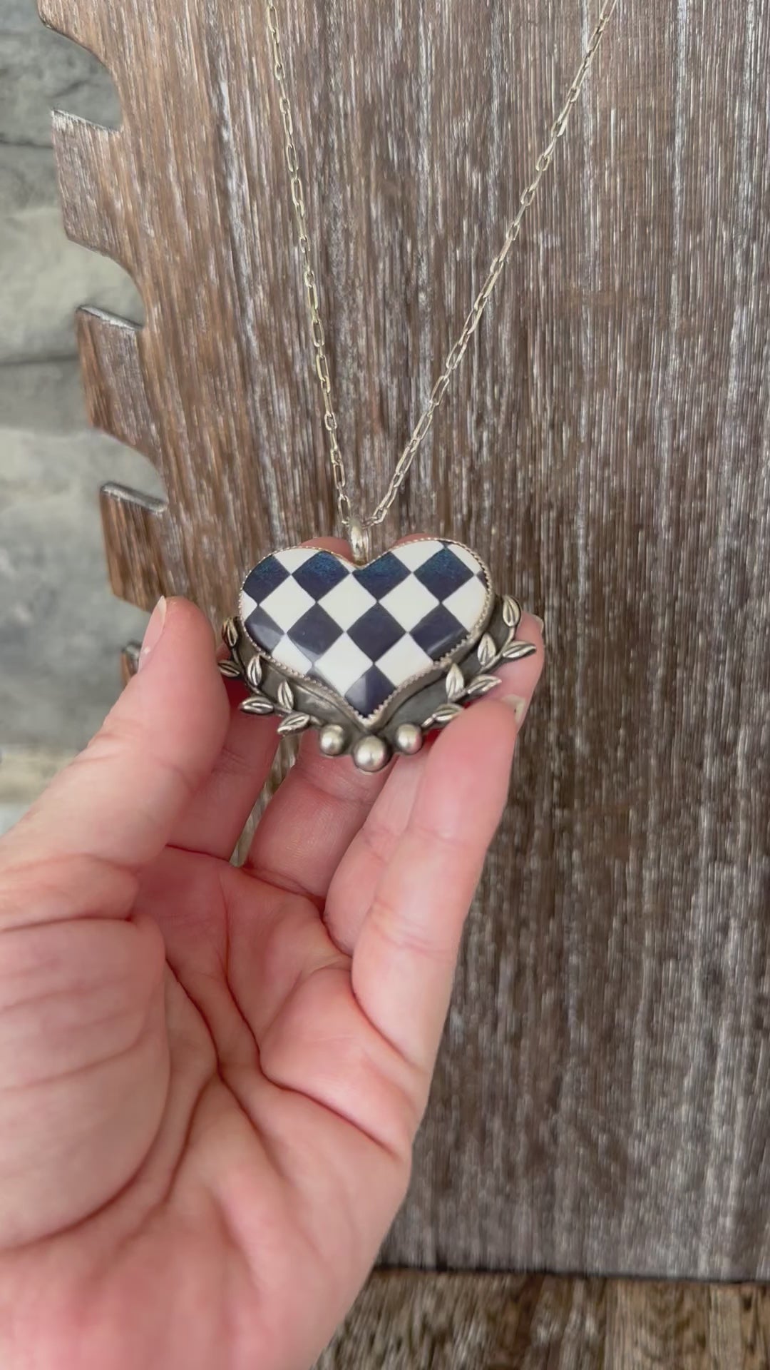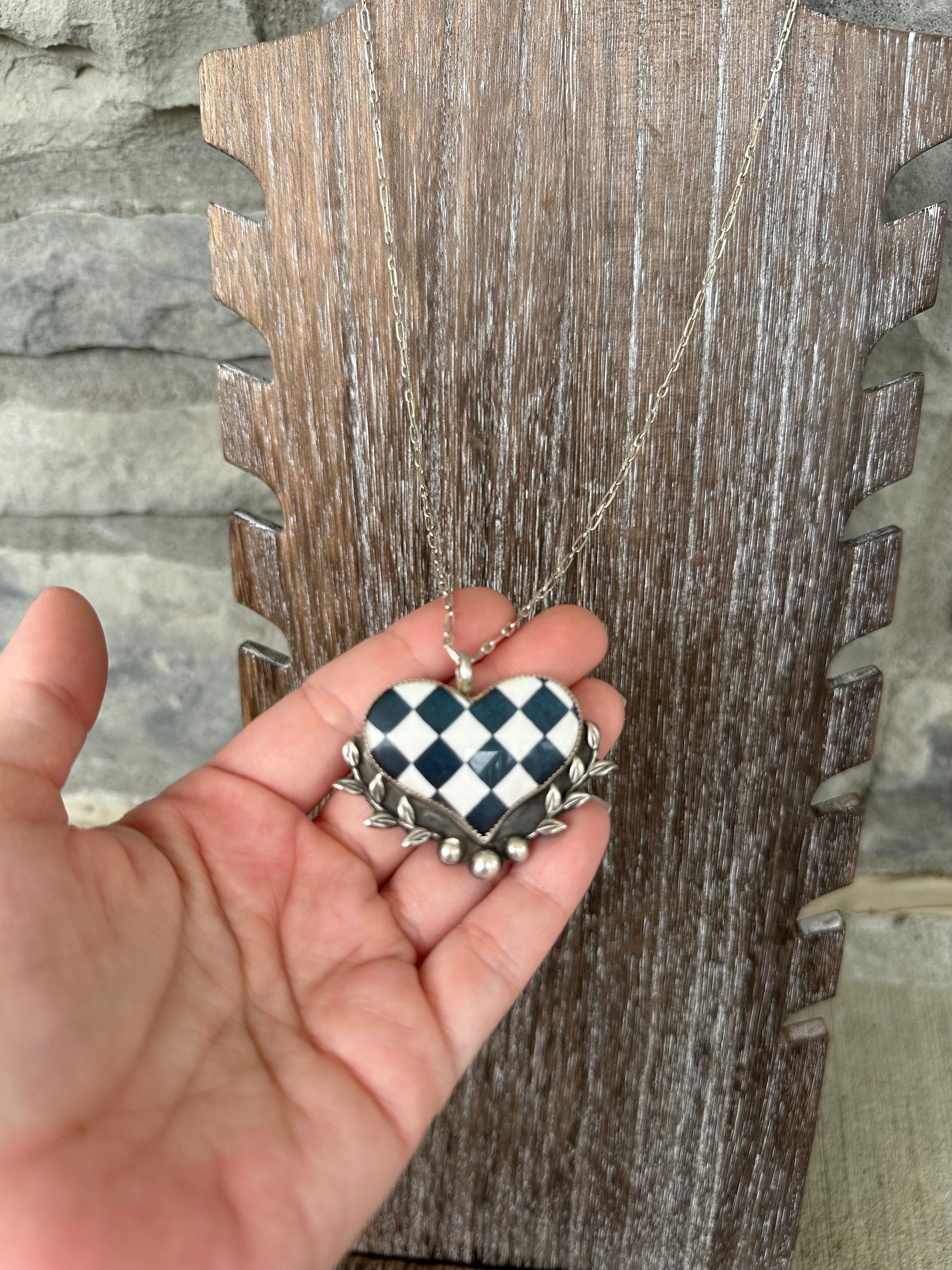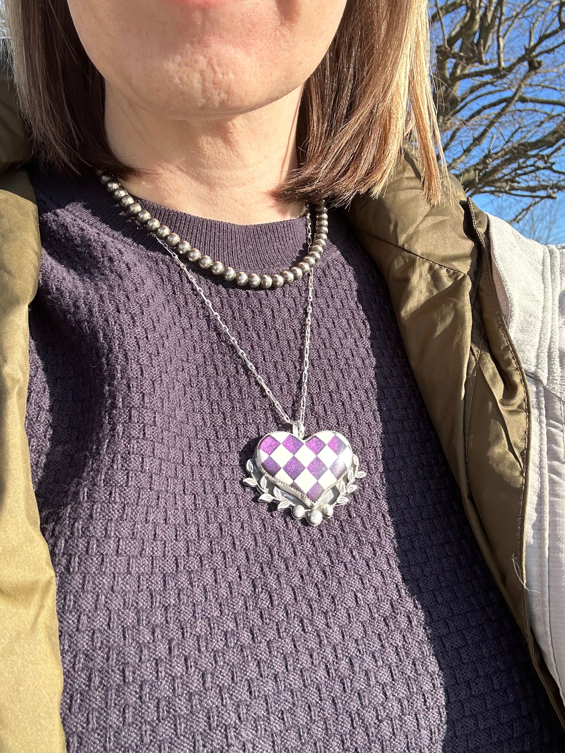 This mosaic heart is a show stopper. This pieces has a color shift from purple to blue to almost black with sparkle. See videos for color shift. Bail on this is a little bigger so you could wear this with a small beaded pearl necklace. Sterling and fine silver