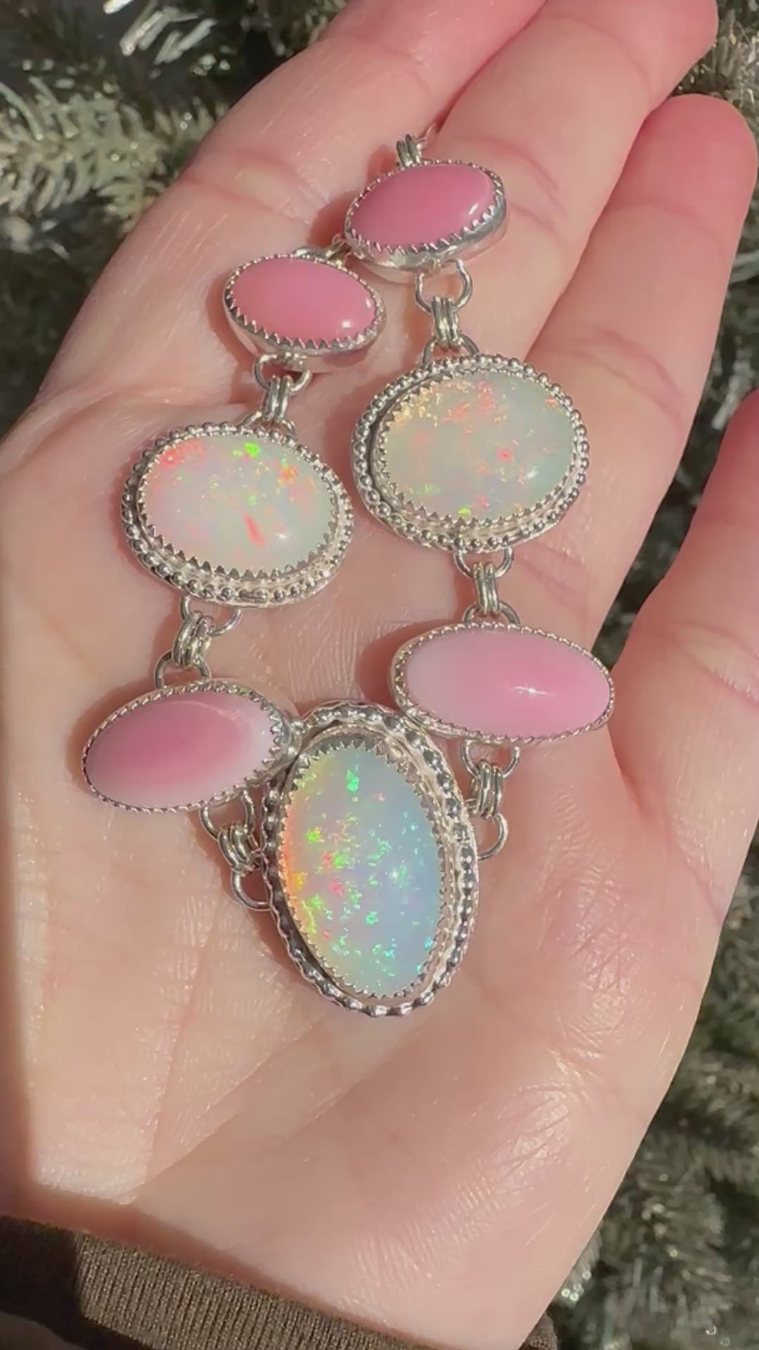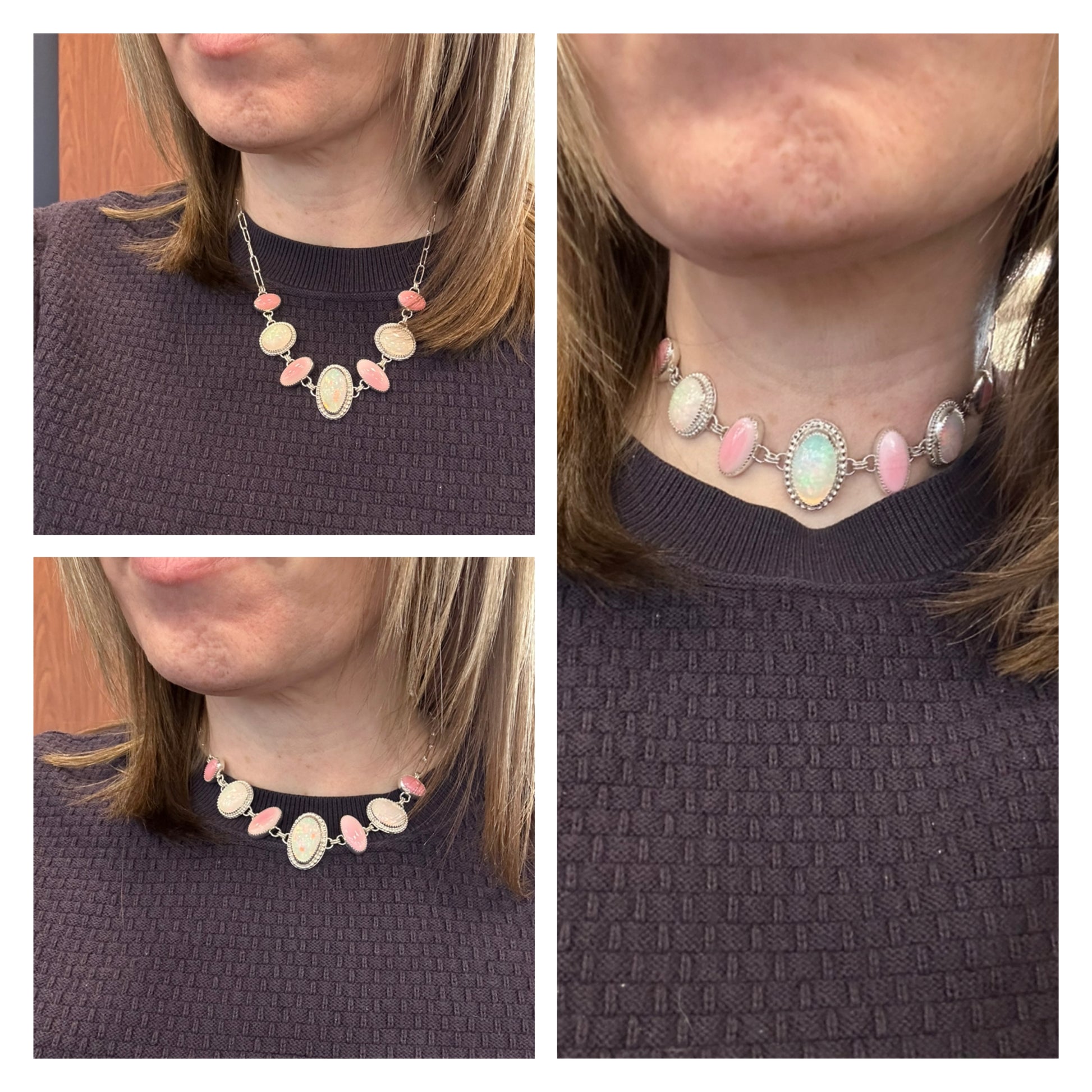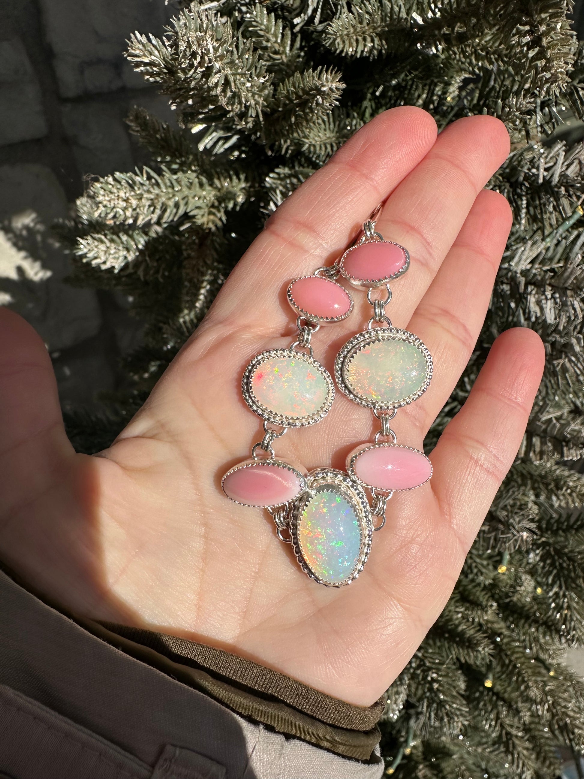 This beautiful statement necklace features 3 pin fire and confetti flash opals with 4 pink conch shell. 17 inches long and has an adjustable paperclip sterling silver chain. Sterling silver and Fine silver.