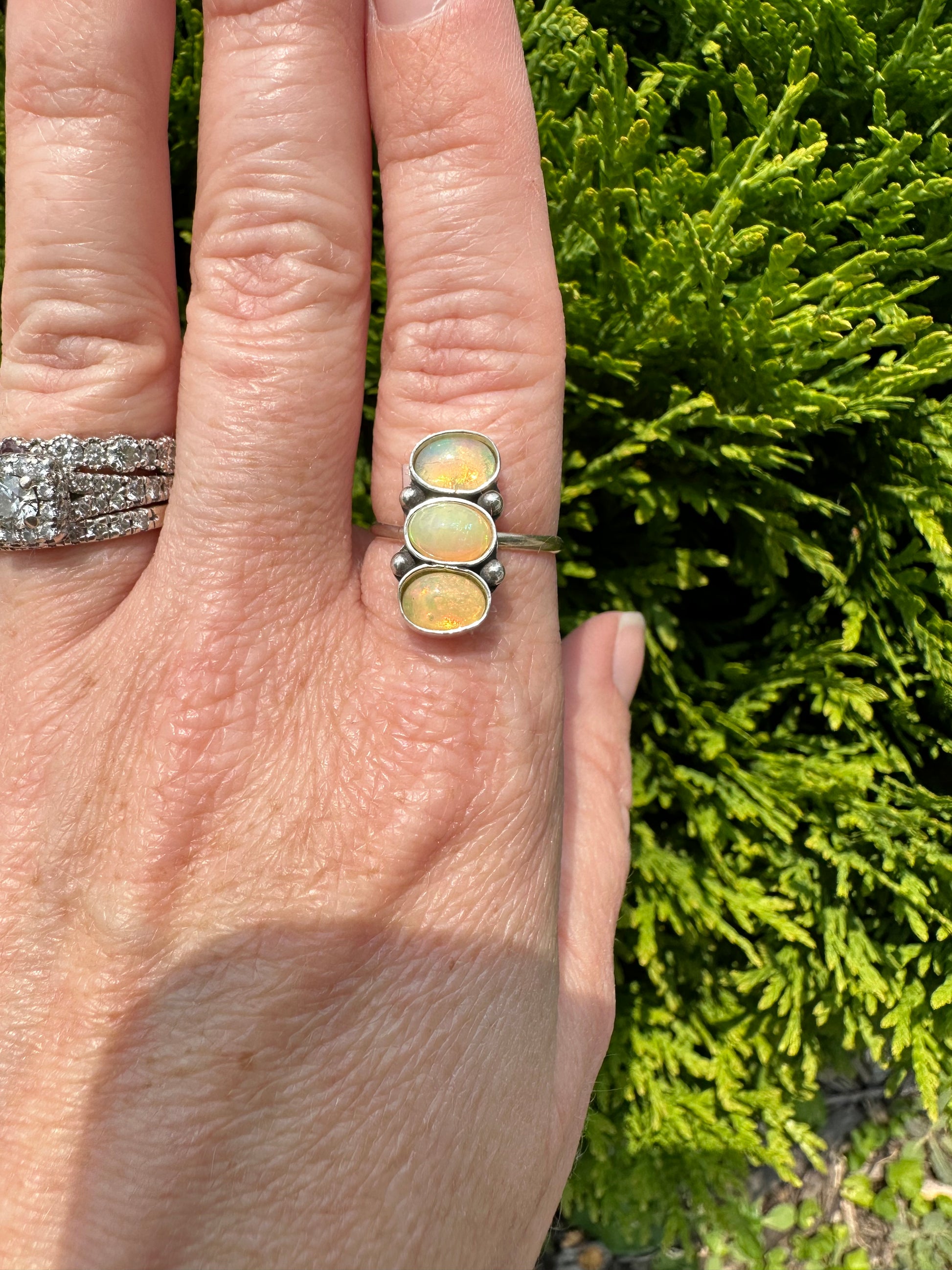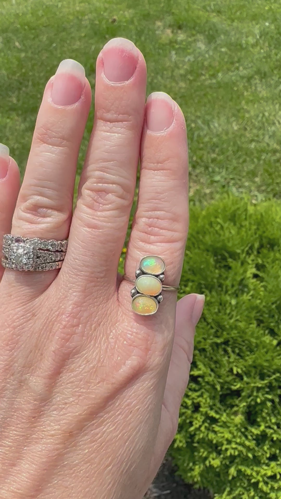 Made with 3 absolutely beautiful opals and adorned with four sterling silver ball accents. .925 sterling silver and .999 fine silver were used to make this ring
