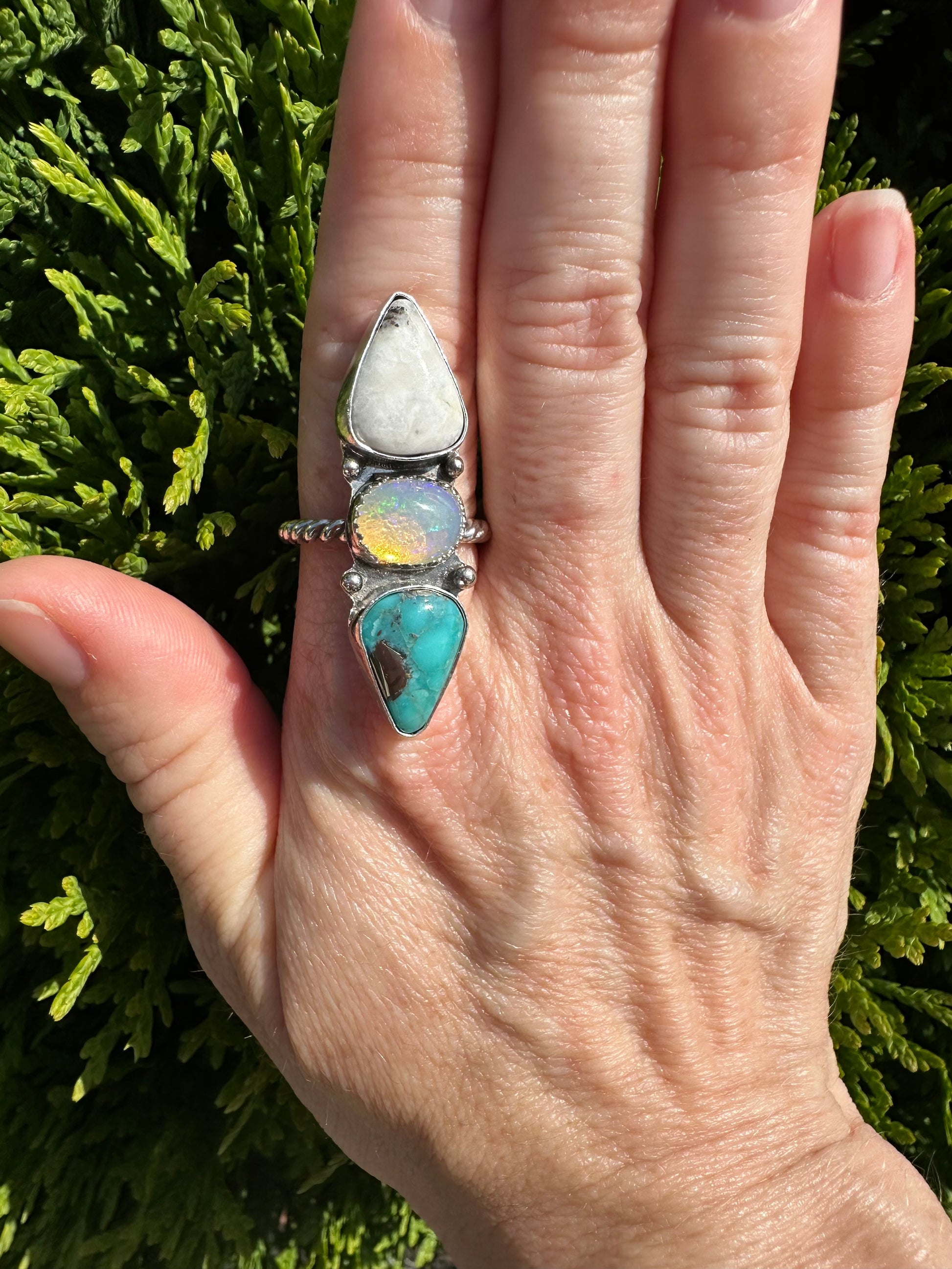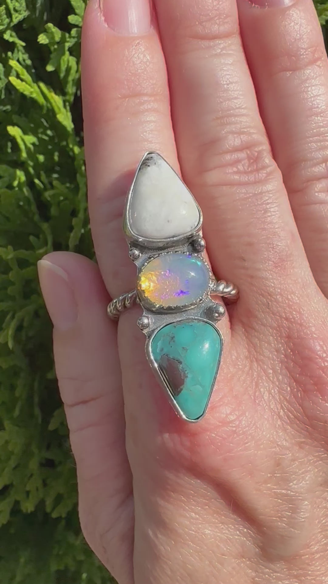 Kingman, Welo Opal, White buffalo. Ring band is a heavy gauge twist wire. All sterling silver and fine silver.