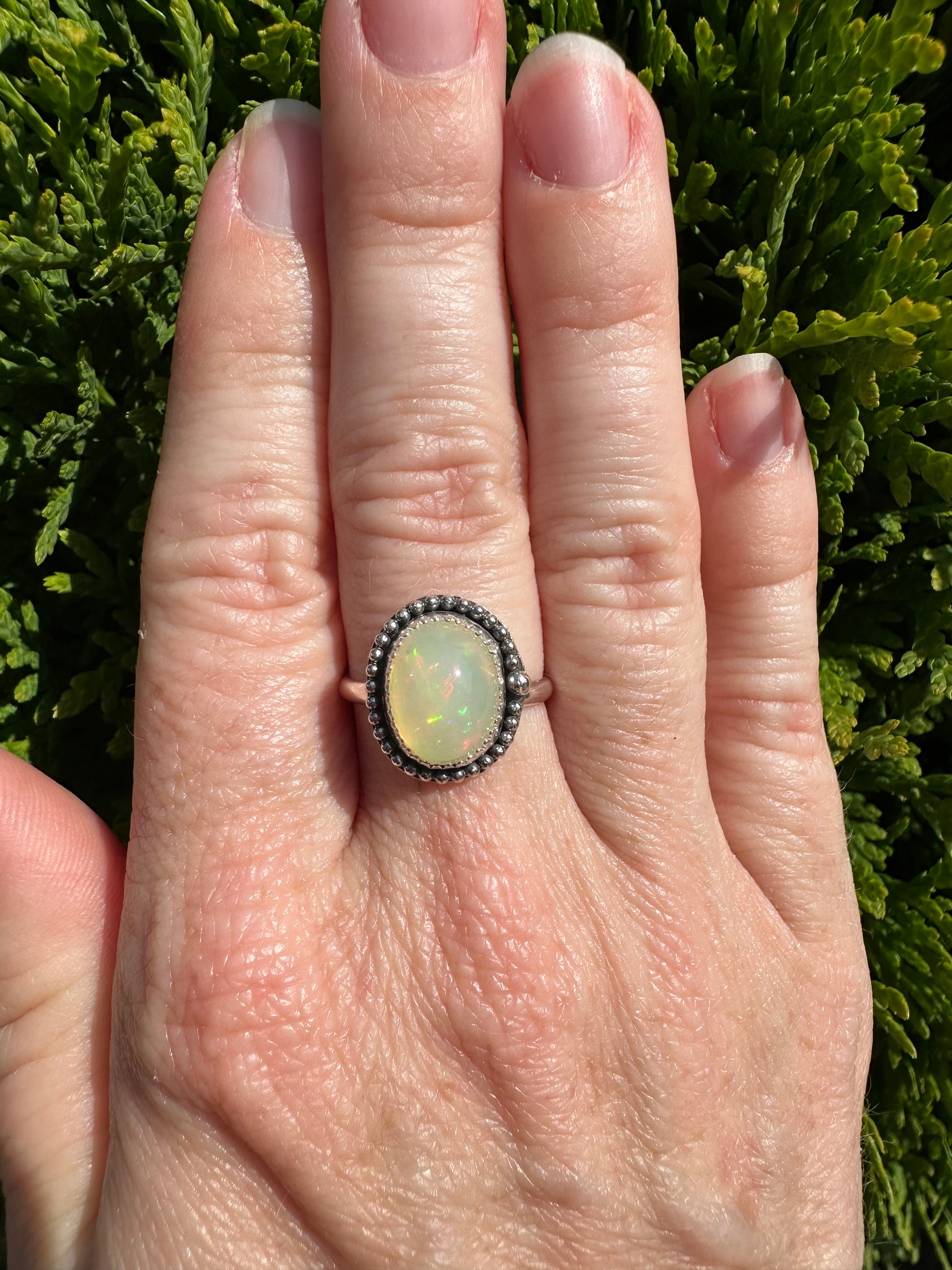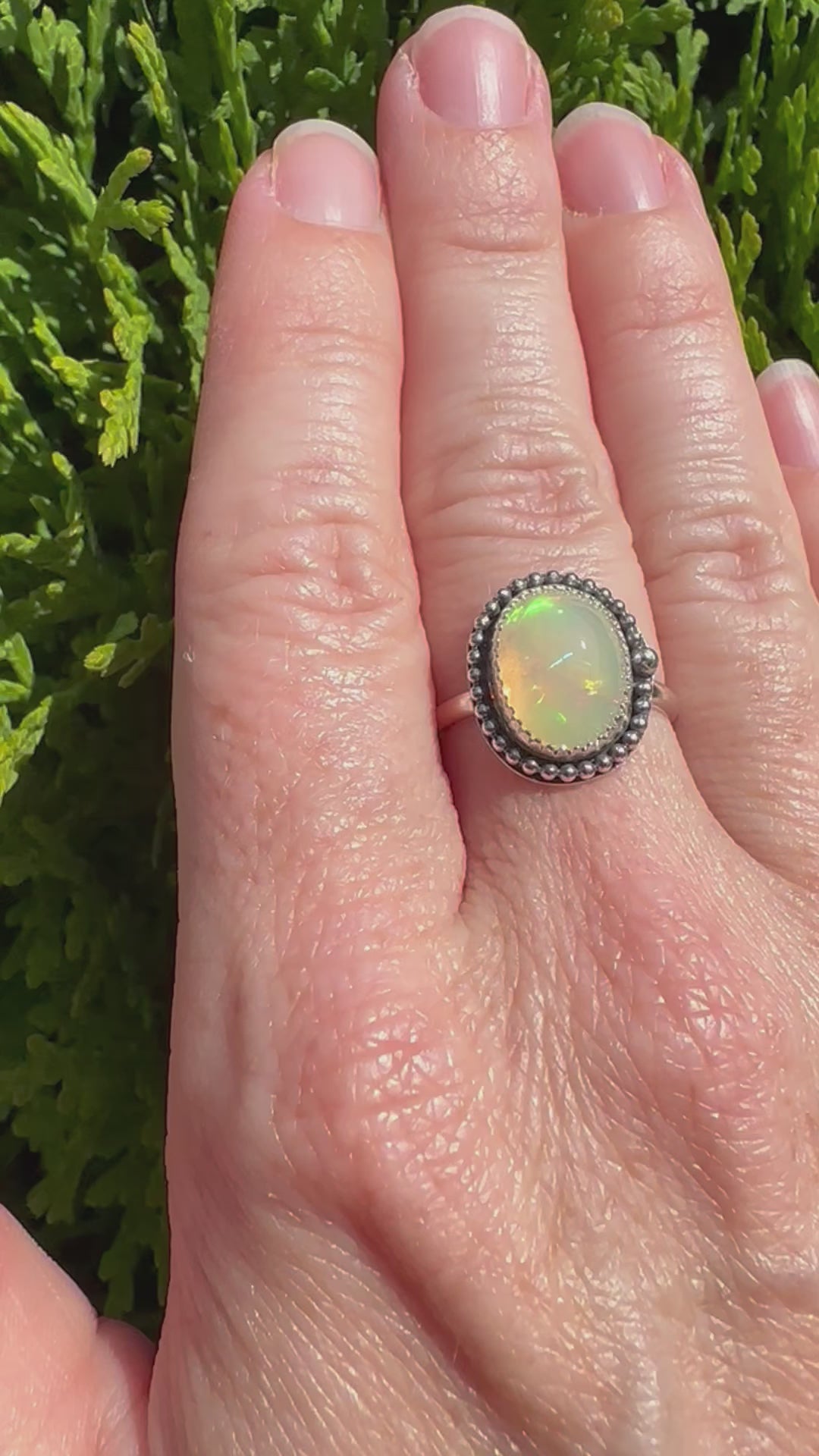Beautiful rainbow flash on this Welo opal. Size 7 and made of sterling and fine silver